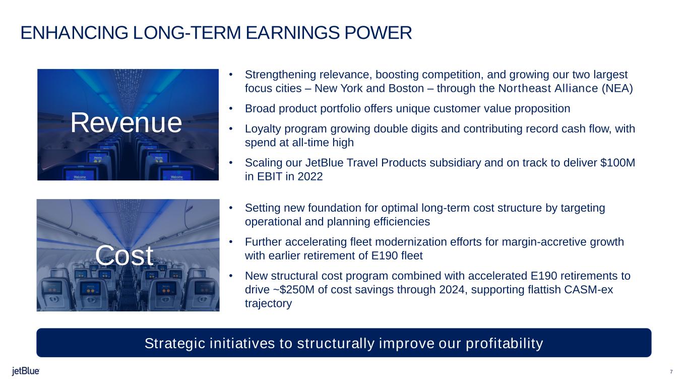 私たちは、コストを低く抑えるための新たな計画に着手しており、部門横断的なコストに焦点を当て、業務および計画の効率化に関するベストプラクティスを適用しています。事業の強い底力と、北東アライアンスからロイヤリティ・プログラムの進化、ジェットブルー・トラベル・プロダクツの規模拡大、そして今回の新しい構造的コストプログラムに至るまで、様々な戦略的イニシアチブの継続的実行を通じて、私たちは長期収益の可能性を構造的に改善する基盤を確立しています。"