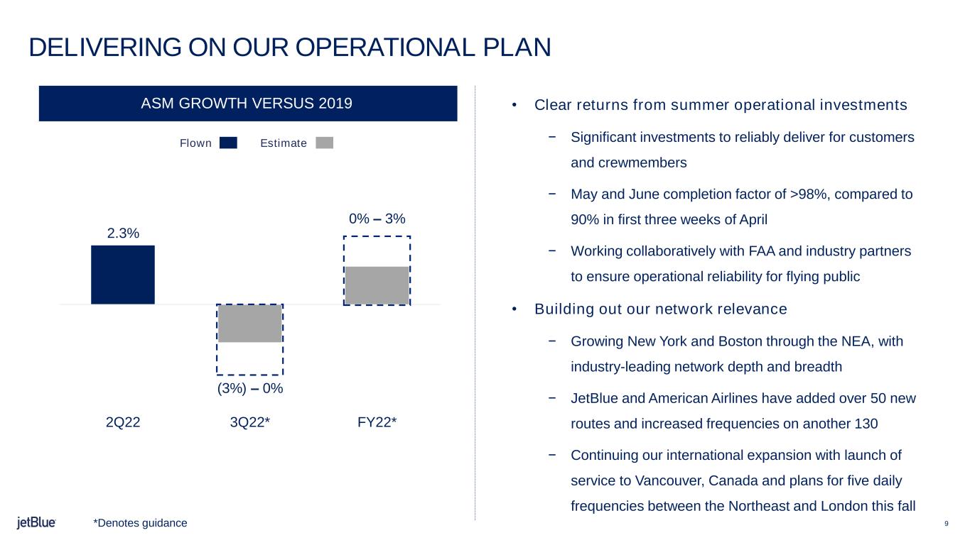 -ジェットブルーの長期的な最適コスト構造の見直しに続き、業務および計画の効率化に焦点を当てた新プログラムの立ち上げを発表しました。第 2 四半期には、航空会社全体の構造的な効率性をより長期的に引き出すための新たなエンタープライズ・プラン ニング・チームの設立を発表しました。