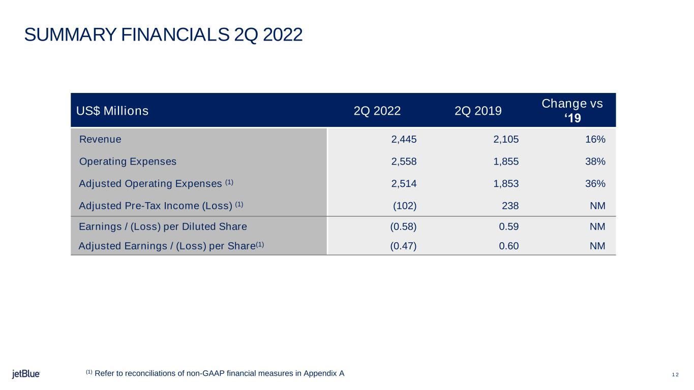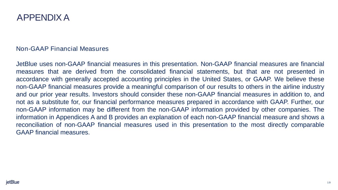 a.非GAAP財務指標。注記Aは、本リリースで使用されている非GAAP財務指標の調整表で、これらの非GAAP財務指標の表示がジェットブルーの財務状況および業績に関して投資家に有用な情報を提供すると経営陣が考える理由を説明しています。