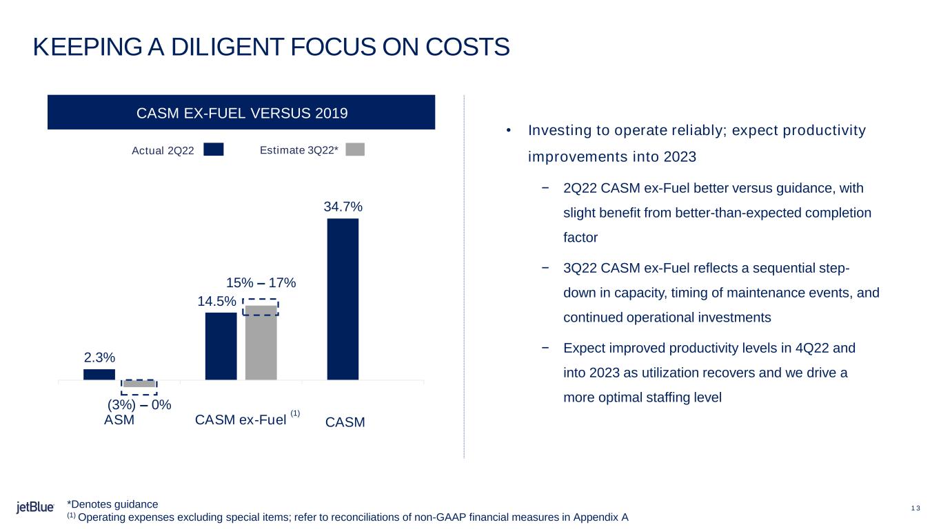 "第3四半期については、CASM ex-Fuel(4)が15~17%増加すると予測しています。また、2022年通期のCASM ex-Fuel(4)は、2019年に対して11~14%の範囲で増加するとの見通しを厳しくしています。私たちは、夏のピークを越えれば、運用投資の高水準は正常化すると考えています。その結果、第4四半期および2023年に向けて、生産性の改善が見られると予想しています。