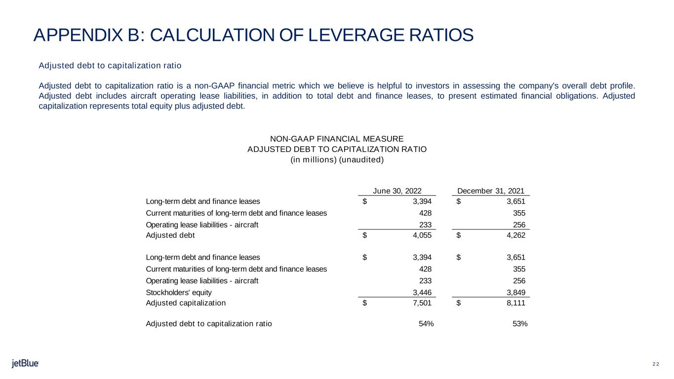 -2022年6月30日現在、ジェットブルーの調整後負債比率は54%(1)です。
