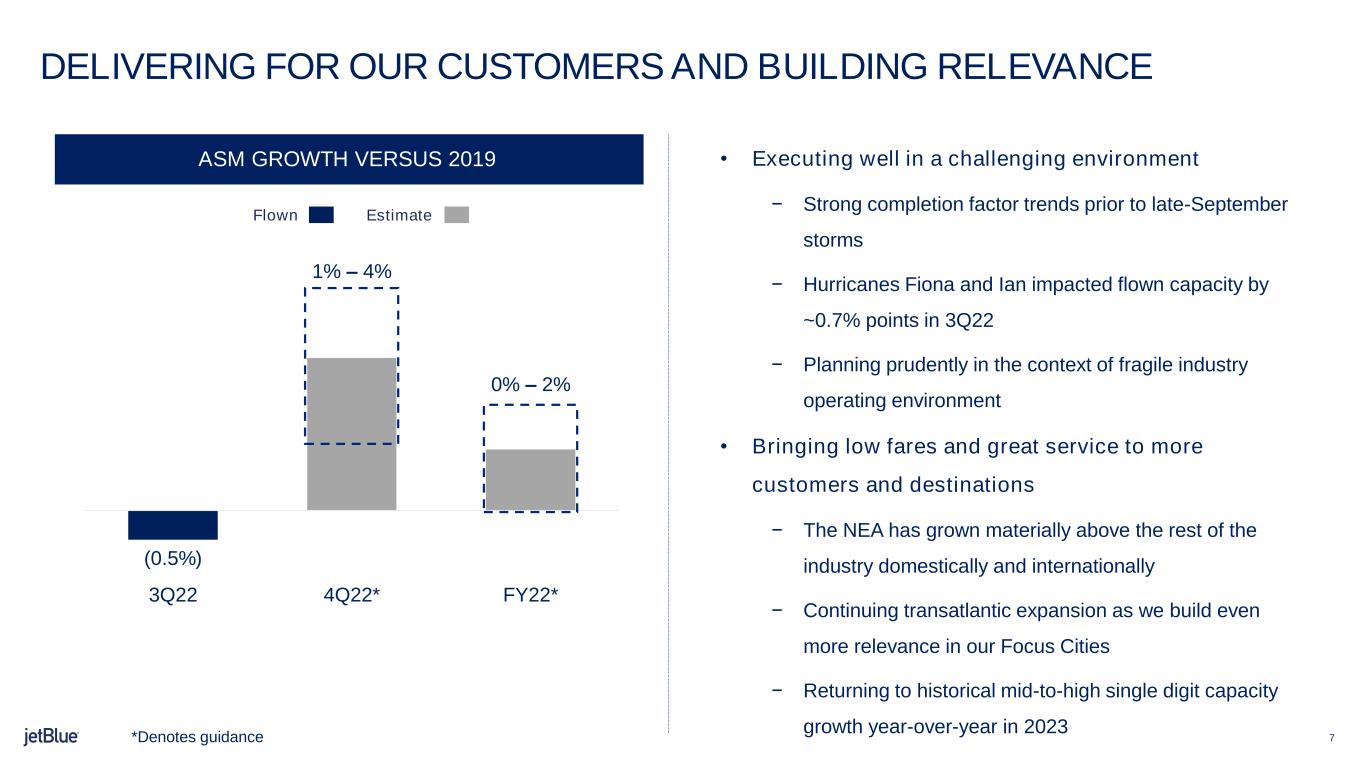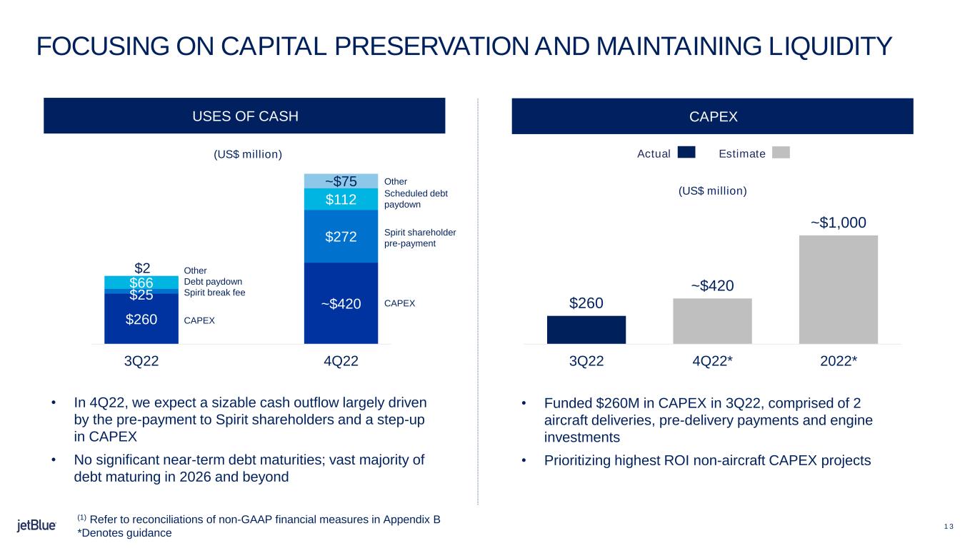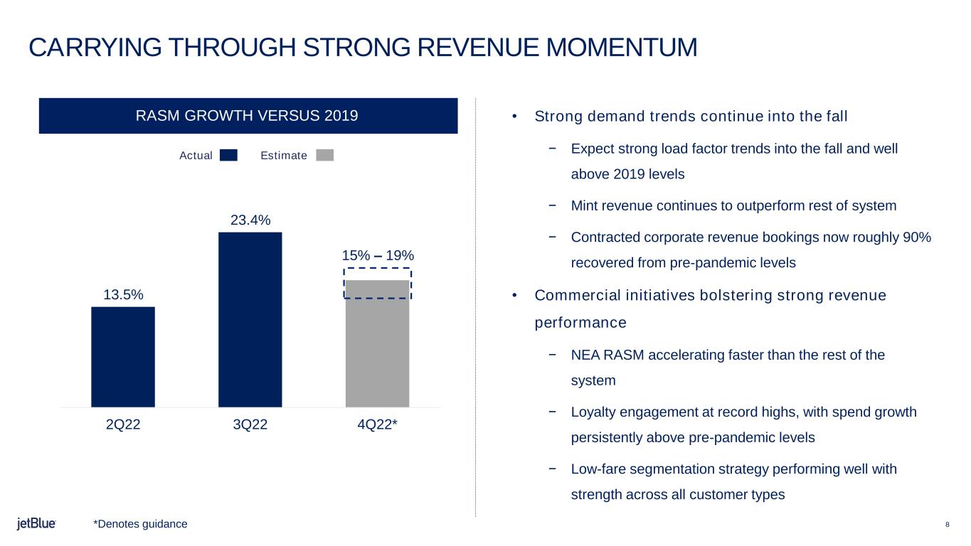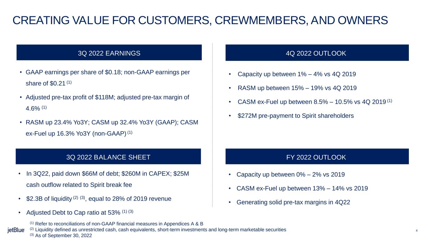 •JetBlue ended the third quarter of 2022 with approximately $2.3 billion in unrestricted cash, cash equivalents, short-term investments, and long-term marketable securities, or 28% of 2019 revenue.