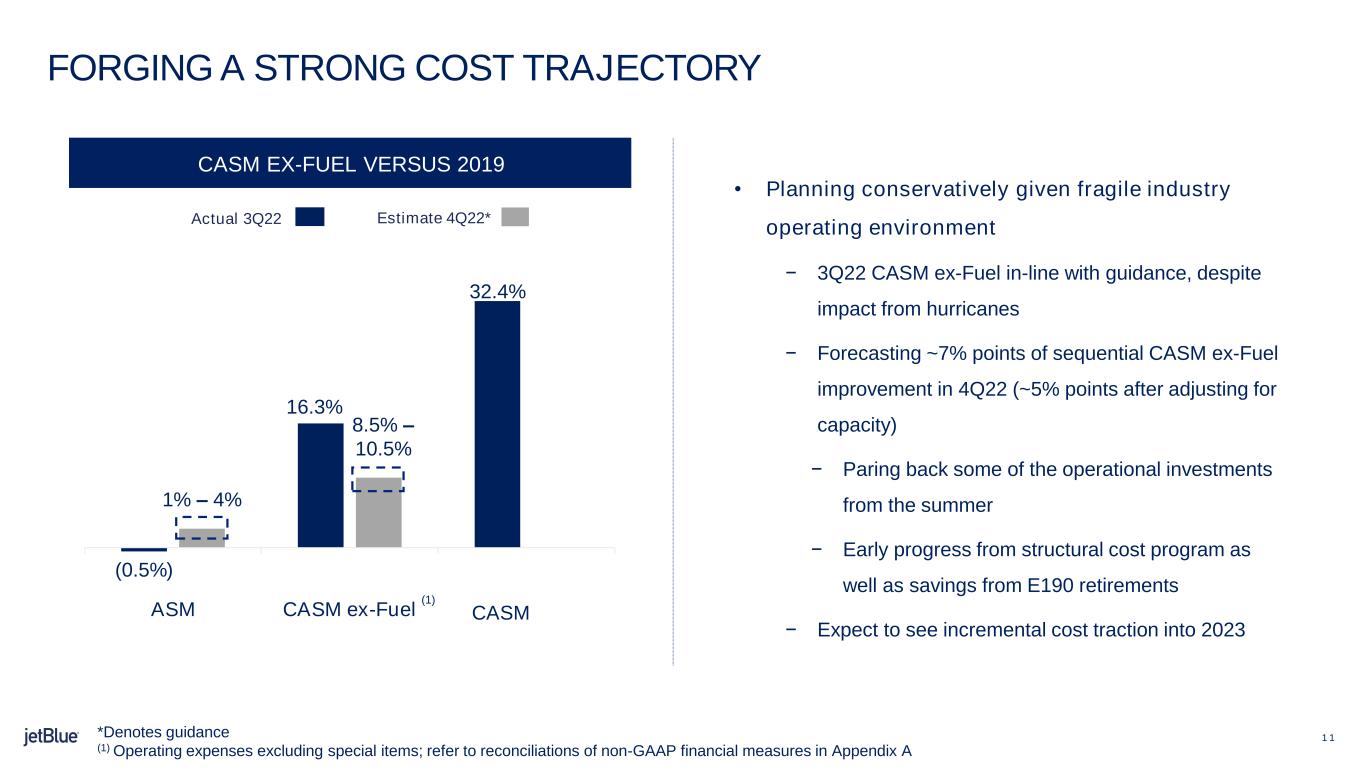For the fourth quarter, we are forecasting CASM ex-Fuel(2) to increase 8.5% to 10.5% year over three. This represents a sequential improvement of approximately 7 points, driven by efficiencies as we scale capacity up as well as early progress on our recently announced structural cost program.