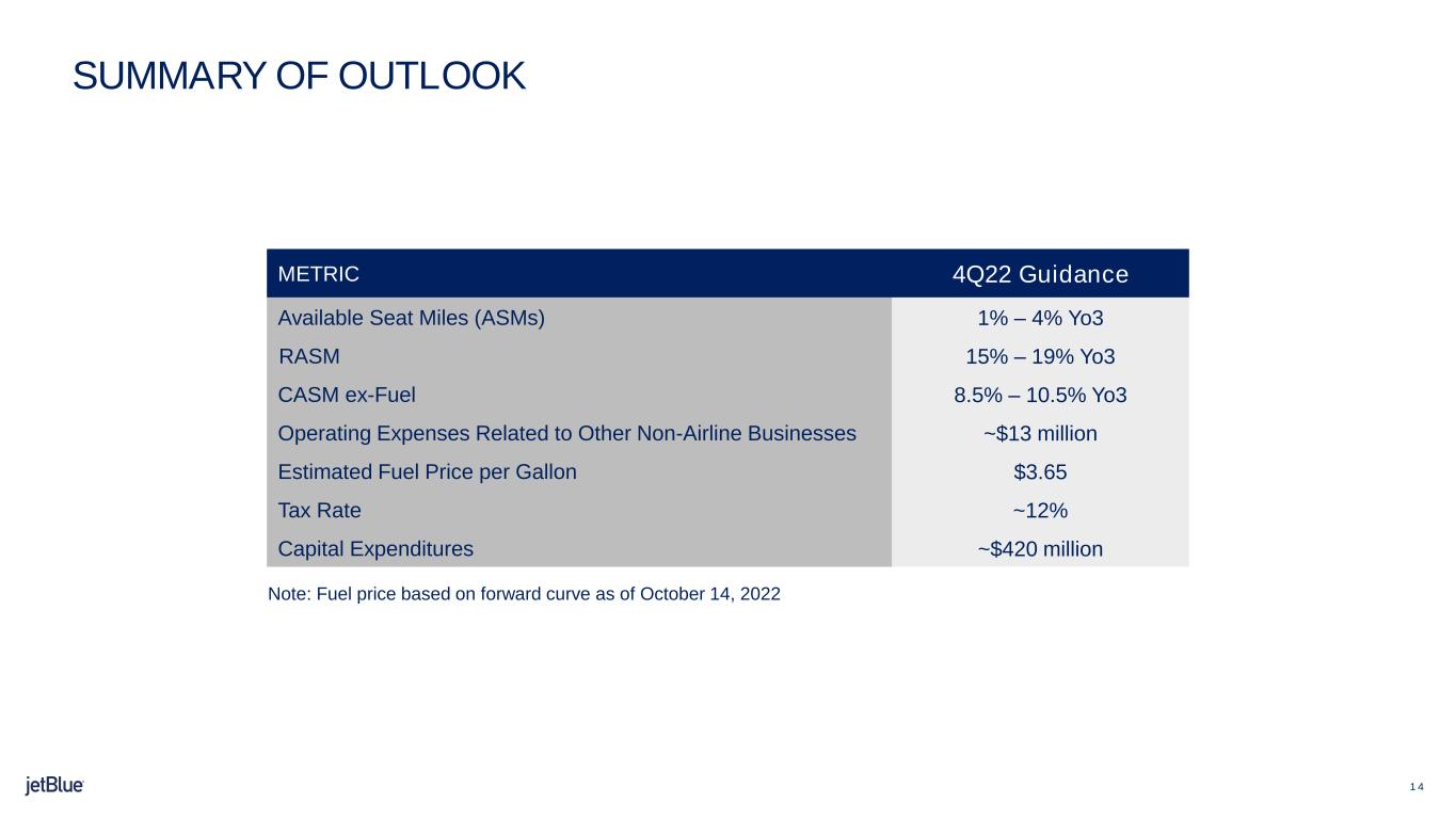 •As of October 25, 2022, JetBlue has entered into forward fuel derivative contracts to hedge an estimated 27% of its fuel consumption for the fourth quarter of 2022. Based on the forward curve as of October 14, 2022, JetBlue expects an average all-in price per gallon of fuel of $3.65 in the fourth quarter of 2022, including hedges.