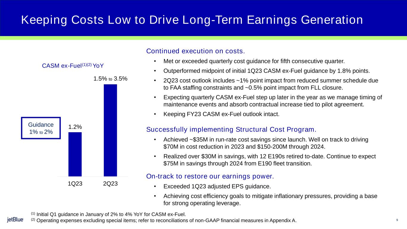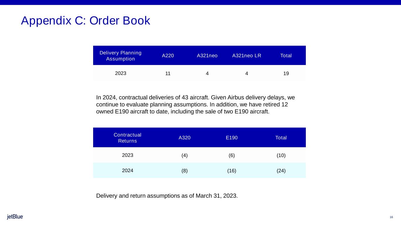This Earnings Release (or otherwise made by JetBlue or on JetBlue’s behalf) contains various forward-looking statements within the meaning of Section 27A of the Securities Act of 1933, as amended, or the Securities Act, and Section 21E of the Securities Exchange Act of 1934, as amended, or the Exchange Act, which represent our management’s beliefs and assumptions concerning future events. These statements are intended to qualify for the “safe harbor” from liability established by the Private Securities Litigation Reform Act of 1995. When used in this document, the words “expects,” “plans,” “intends,” “anticipates,” “indicates,” “remains,” “believes,” “estimates,” “forecast,” “guidance,” “outlook,” “may,” “will,” “should,” “seeks,” “goals,” “targets” and similar expressions are intended to identify forward-looking statements. Additionally, forward-looking statements include statements that do not relate solely to historical facts, such as statements which identify uncertainties or trends, discuss the possible future effects of current known trends or uncertainties, or which indicate that the future effects of known trends or uncertainties cannot be predicted, guaranteed, or assured. Forward-looking statements involve risks, uncertainties and assumptions, and are based on information currently available to us. Actual results may differ materially from those expressed in the forward-looking statements due to many factors, including, without limitation, the COVID-19 pandemic and government-imposed measures to control its spread; risk associated with execution of our strategic operating plans in the near-term and long-term; our extremely competitive industry; risks related to the long-term nature of our fleet order book; volatility in fuel prices and availability of fuel; increased maintenance costs associated with fleet age; costs associated with salaries, wages and benefits; risks associated with doing business internationally; our reliance on high daily aircraft utilization; our dependence on the New York metropolitan market; risks associated with extended interruptions or disruptions in service at our focus cities; risks associated with airport expenses; risks associated with seasonality and weather; our reliance on a limited number of suppliers; risks related to new or increased tariffs imposed on commercial aircraft and related parts imported from outside the United States; the outcome of lawsuits filed against us related to our Northeast Alliance with American Airlines Group Inc.; the occurrence of any event, change or other circumstances that could give rise to the right of JetBlue or Spirit Airlines Inc. (“Spirit”) or both of them to terminate the Merger Agreement; failure to obtain certain governmental approvals necessary to consummate the merger with Spirit (the “Merger”); the outcome of the lawsuit filed by the Department of Justice and certain state Attorneys General against us and Spirit related to the Merger; risks associated with failure to consummate the Merger in a timely manner or at all; risks associated with the pendency of the Merger and related business disruptions; indebtedness following consummation of the Merger and associated impacts on business flexibility, borrowing costs and credit ratings; the possibility that JetBlue may be unable to achieve expected synergies and operating efficiencies within the expected timeframes or at all; challenges associated with successful integration of Spirit's operations; expenses related to the Merger and integration of Spirit; the potential for loss of management personnel and other key crewmembers as a result of the Merger; risks associated with effective management of the combined company following the Merger; risks associated with JetBlue being bound by all obligations and liabilities of Spirit following consummation of the Merger; risks associated with the integration of JetBlue and Spirit workforce, including with respect to negotiation of labor agreements and labor costs; the impact of the Merger on JetBlue’s earnings per share; risks associated with cybersecurity incidents; heightened regulatory requirements concerning data security compliance; risks associated with reliance on, and potential failure of, automated systems; our inability to attract and retain qualified crewmembers; our being subject to potential unionization, work stoppages, slowdowns or increased labor costs; reputational and business risk from an accident or incident involving our aircraft; risks associated with our reputation and brand; our significant fixed obligations; our substantial indebtedness; financial risks associated with credit card processors; restrictions as a result of our participation in governmental support programs; risks associated with seeking short-term additional financing liquidity; failure to realize the value of intangible or long-lived assets; risks associated with disease outbreaks or environmental disasters affecting travel behavior; compliance with future environmental regulations; the impacts of federal budget constraints or federally imposed furloughs; climate change; changes in government regulations in our industry; acts of war or terrorism; global economic conditions or an economic downturn leading to a continuing or accelerated decrease in demand for air travel; and risks associated with the implementation of 5G wireless technology near airports that we operate in. It is routine for our internal projections and expectations to change as the year or each quarter in the year progresses, and therefore it should be clearly understood that the internal projections, beliefs, and assumptions upon which we base our expectations may change prior to the end of each quarter or year.