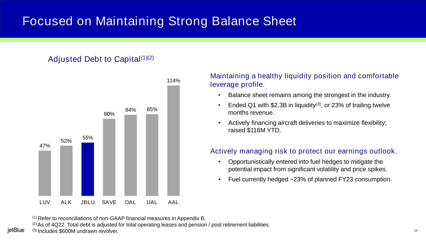 (5)ジェットブルーは、プロンプトクォーターのヘッジなし部分を計算するために、フォワードブレント原油カーブとフォワードブレント原油とジェットのクラックスプレッドを利用します。2023年4月14日現在、2023年第2四半期のフォワード・ブレント原油の1バレルあたりの価格は86ドル、クラック・スプレッドは平均16ドルでした。
