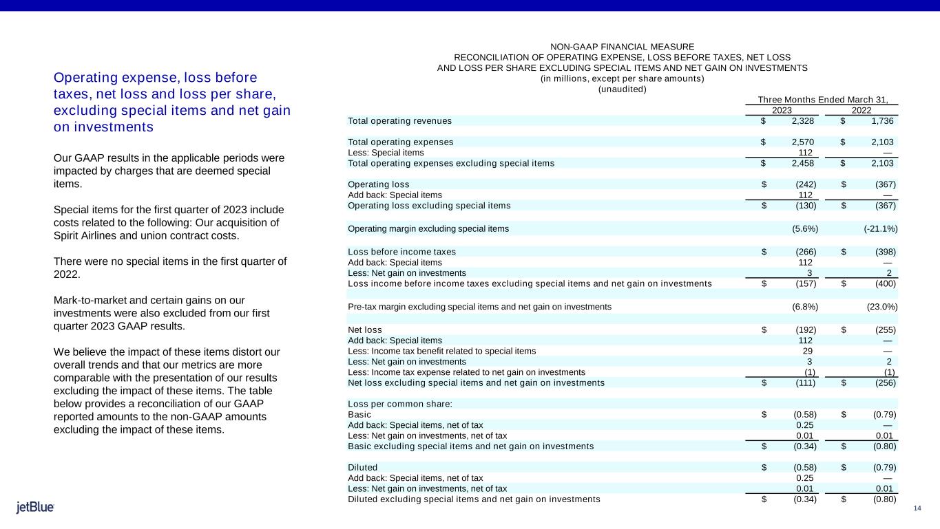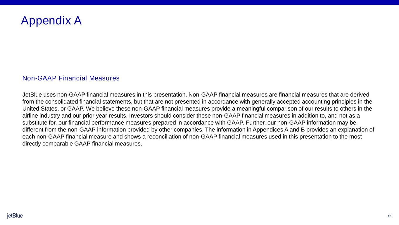 (1)非GAAP財務指標;注記Aは、本リリースで使用されている非GAAP財務指標の調整表を提供し、これらの非GAAP財務指標の表示がジェットブルーの財務状況および経営成績について投資家に有用な情報を提供すると経営陣が考える理由を説明しています。