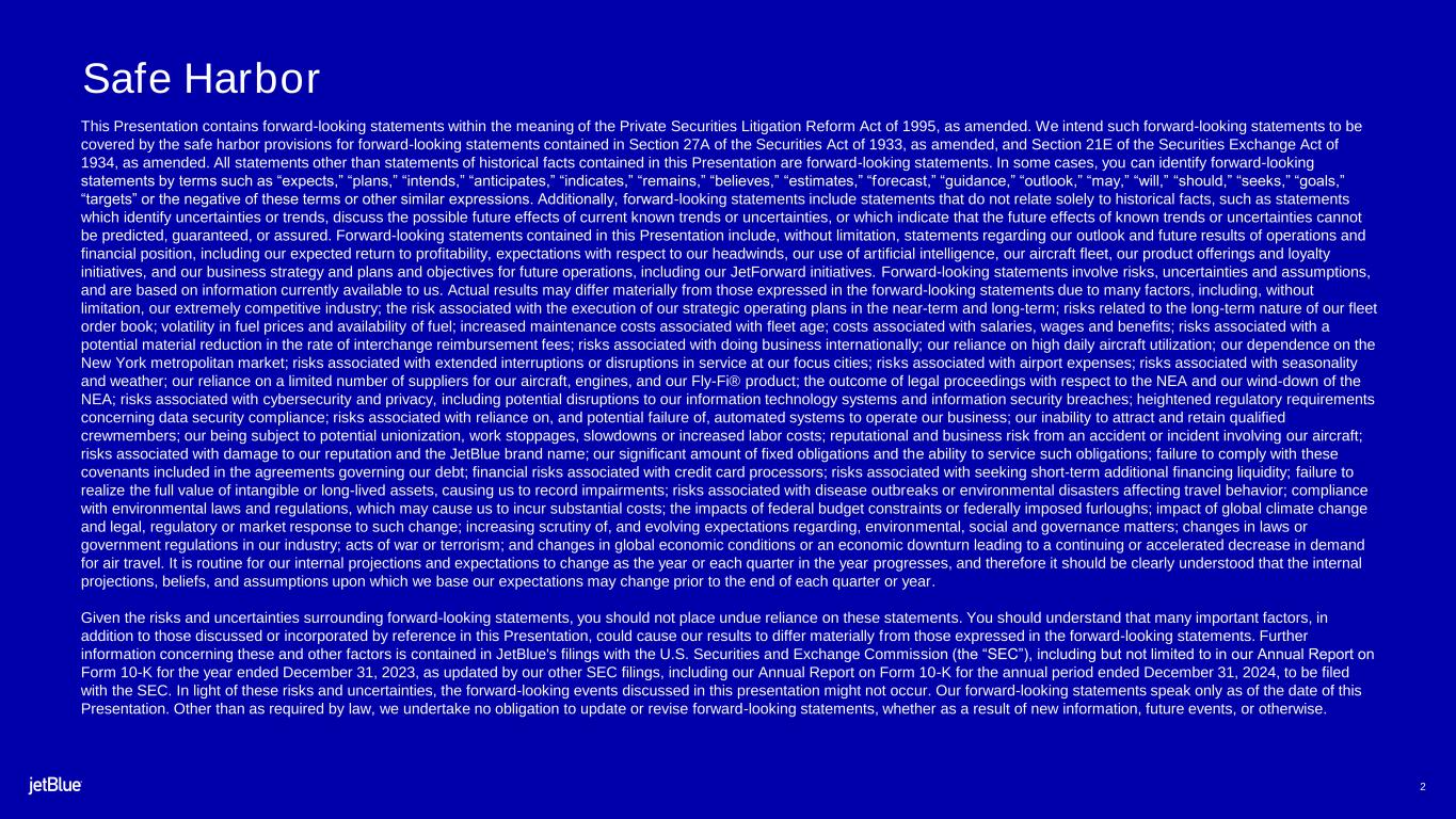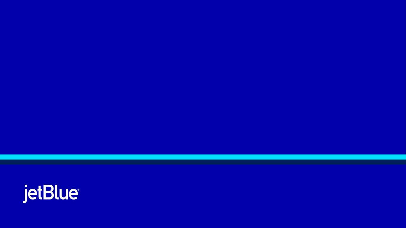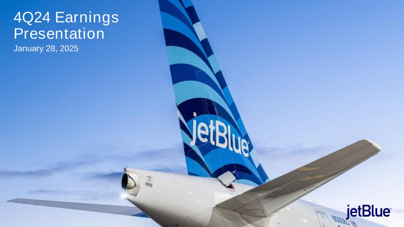 This Earnings Release contains forward-looking statements within the meaning of the Private Securities Litigation Reform Act of 1995, as amended. We intend such forward-looking statements to be covered by the safe harbor provisions for forward-looking statements contained in Section 27A of the Securities Act of 1933, as amended (the "Securities Act"), and Section 21E of the Securities Exchange Act of 1934, as amended (the "Exchange Act"). All statements other than statements of historical facts contained in this Release are forward-looking statements. In some cases, you can identify forward-looking statements by terms such as "expects," "plans" "intends," "anticipates," "indicates," "remains," "believes," "estimates," "forecast," "guidance," "outlook," "may," "will," "should," "seeks," "goals," "targets" or the negative of these terms or other similar expressions. Additionally, forward-looking statements include statements that do not relate solely to historical facts, such as statements which identify uncertainties or trends, discuss the possible future effects of current known trends or uncertainties, or which indicate that the future effects of known trends or uncertainties cannot be predicted, guaranteed, or assured. Forward-looking statements contained in this Earnings Release include, without limitation, statements regarding our outlook and future results of operations and financial position, including our expected return to profitability, any expected headwinds, our product offerings and loyalty initiatives, and our business strategy and plans and objectives for future operations, including our JetForward initiatives. Forward-looking statements involve risks, uncertainties and assumptions, and are based on information currently available to us. Actual results may differ materially from those expressed in the forward-looking statements due to many factors, including, without limitation, our extremely competitive industry; the risk associated with the execution of our strategic operating plans in the near- term and long-term; risks related to the long-term nature of our fleet order book; volatility in fuel prices and availability of fuel; increased maintenance costs associated with fleet age; costs associated with salaries, wages and benefits; risks associated with a potential material reduction in the rate of interchange reimbursement fees; risks associated with doing business internationally; our reliance on high daily aircraft utilization; our dependence on the New York metropolitan market; risks associated with extended interruptions or disruptions in service at our focus cities; risks associated with airport expenses; risks associated with seasonality and weather; our reliance on a limited number of suppliers for our aircraft, engines, and our Fly-Fi® product; the outcome of legal proceedings with respect to the NEA and our wind-down of the NEA; risks associated with cybersecurity and privacy, including potential disruptions to our information technology systems and information security breaches; heightened regulatory requirements concerning data security compliance; risks associated with reliance on, and potential failure of, automated systems to operate our business; our inability to attract and retain qualified crewmembers; our being subject to potential unionization, work stoppages, slowdowns or increased labor costs; reputational and business risk from an accident or incident involving our aircraft; risks associated with damage to our reputation and the JetBlue brand name; our significant amount of fixed obligations and the ability to service such obligations; failure to comply with these covenants included in the agreements governing our debt; financial risks associated with credit card processors; risks associated with seeking short-term additional financing liquidity; failure to realize the full value of intangible or long-lived assets, causing us to record impairments; risks associated with disease outbreaks or environmental disasters affecting travel behavior; compliance with environmental laws and regulations, which may cause us to incur substantial costs; the impacts of federal budget constraints or federally imposed furloughs; impact of global climate change and legal, regulatory or market response to such change; increasing scrutiny of, and evolving expectations regarding, environmental, social and governance matters; changes in laws or government regulations in our industry; acts of war or terrorism; and changes in global economic conditions or an economic downturn leading to a continuing or accelerated decrease in demand for air travel.