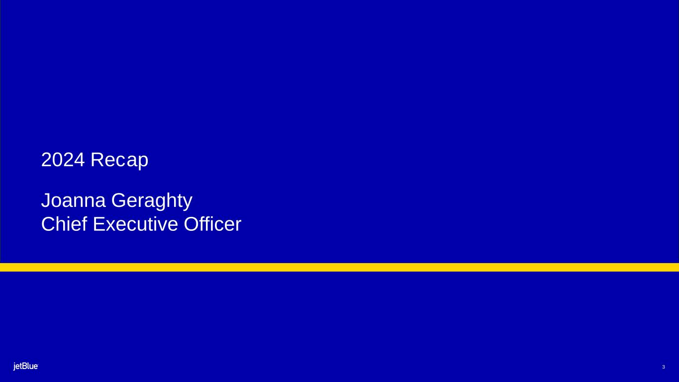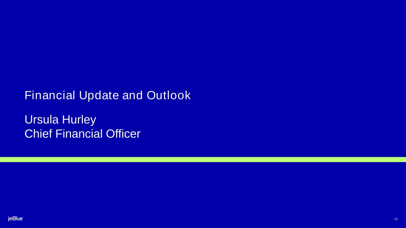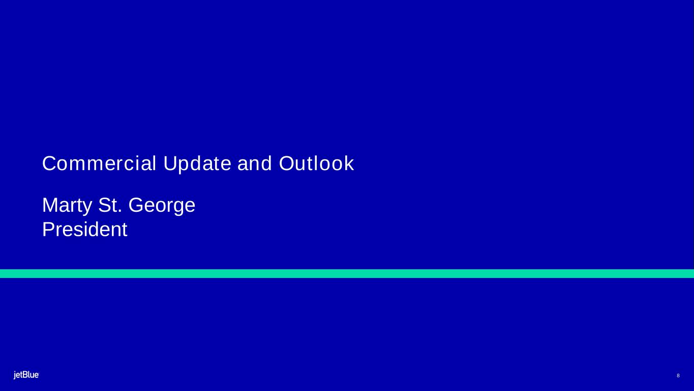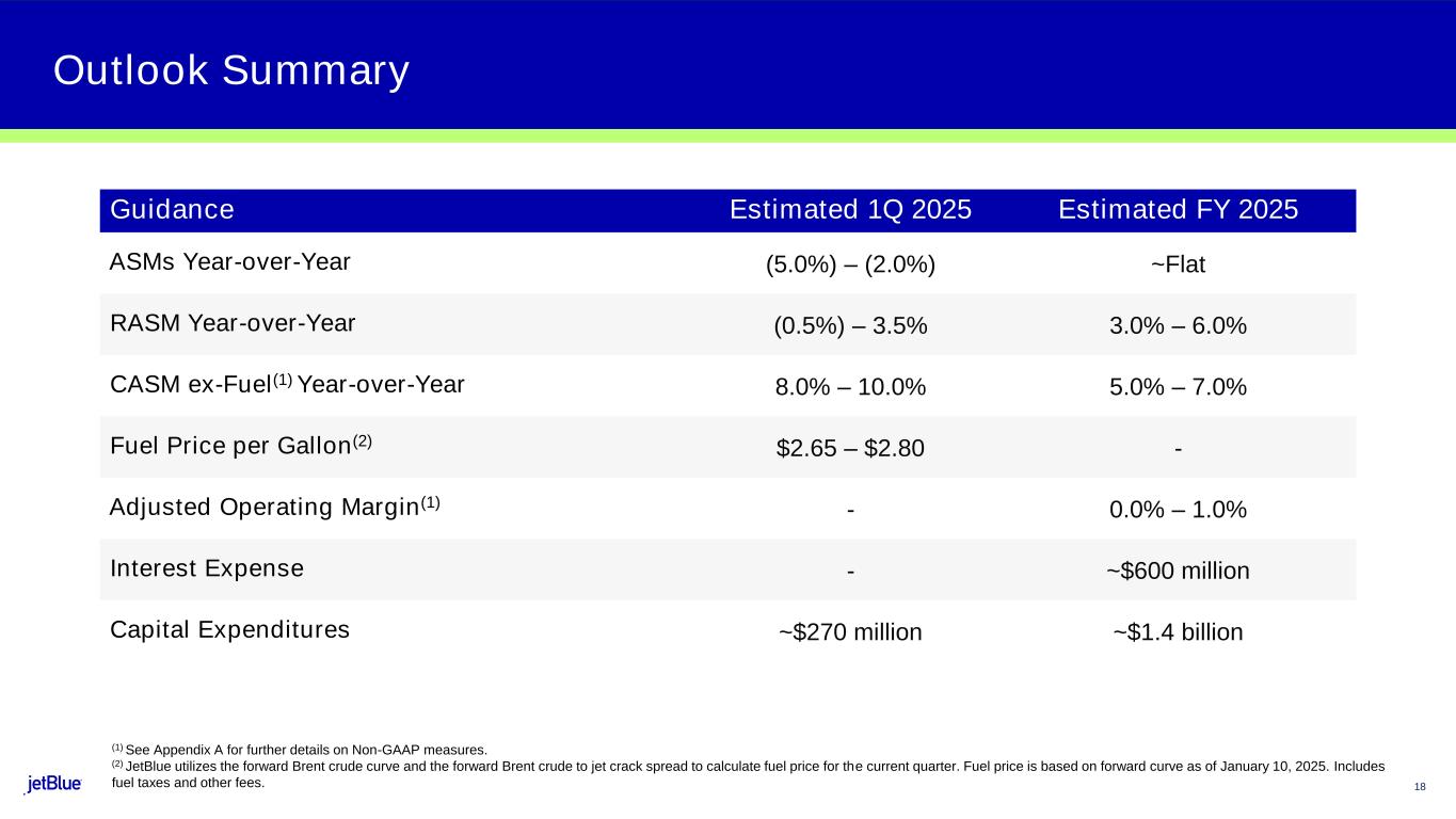 This Earnings Release contains forward-looking statements within the meaning of the Private Securities Litigation Reform Act of 1995, as amended. We intend such forward-looking statements to be covered by the safe harbor provisions for forward-looking statements contained in Section 27A of the Securities Act of 1933, as amended (the "Securities Act"), and Section 21E of the Securities Exchange Act of 1934, as amended (the "Exchange Act"). All statements other than statements of historical facts contained in this Release are forward-looking statements. In some cases, you can identify forward-looking statements by terms such as "expects," "plans" "intends," "anticipates," "indicates," "remains," "believes," "estimates," "forecast," "guidance," "outlook," "may," "will," "should," "seeks," "goals," "targets" or the negative of these terms or other similar expressions. Additionally, forward-looking statements include statements that do not relate solely to historical facts, such as statements which identify uncertainties or trends, discuss the possible future effects of current known trends or uncertainties, or which indicate that the future effects of known trends or uncertainties cannot be predicted, guaranteed, or assured. Forward-looking statements contained in this Earnings Release include, without limitation, statements regarding our outlook and future results of operations and financial position, including our expected return to profitability, any expected headwinds, our product offerings and loyalty initiatives, and our business strategy and plans and objectives for future operations, including our JetForward initiatives. Forward-looking statements involve risks, uncertainties and assumptions, and are based on information currently available to us. Actual results may differ materially from those expressed in the forward-looking statements due to many factors, including, without limitation, our extremely competitive industry; the risk associated with the execution of our strategic operating plans in the near- term and long-term; risks related to the long-term nature of our fleet order book; volatility in fuel prices and availability of fuel; increased maintenance costs associated with fleet age; costs associated with salaries, wages and benefits; risks associated with a potential material reduction in the rate of interchange reimbursement fees; risks associated with doing business internationally; our reliance on high daily aircraft utilization; our dependence on the New York metropolitan market; risks associated with extended interruptions or disruptions in service at our focus cities; risks associated with airport expenses; risks associated with seasonality and weather; our reliance on a limited number of suppliers for our aircraft, engines, and our Fly-Fi® product; the outcome of legal proceedings with respect to the NEA and our wind-down of the NEA; risks associated with cybersecurity and privacy, including potential disruptions to our information technology systems and information security breaches; heightened regulatory requirements concerning data security compliance; risks associated with reliance on, and potential failure of, automated systems to operate our business; our inability to attract and retain qualified crewmembers; our being subject to potential unionization, work stoppages, slowdowns or increased labor costs; reputational and business risk from an accident or incident involving our aircraft; risks associated with damage to our reputation and the JetBlue brand name; our significant amount of fixed obligations and the ability to service such obligations; failure to comply with these covenants included in the agreements governing our debt; financial risks associated with credit card processors; risks associated with seeking short-term additional financing liquidity; failure to realize the full value of intangible or long-lived assets, causing us to record impairments; risks associated with disease outbreaks or environmental disasters affecting travel behavior; compliance with environmental laws and regulations, which may cause us to incur substantial costs; the impacts of federal budget constraints or federally imposed furloughs; impact of global climate change and legal, regulatory or market response to such change; increasing scrutiny of, and evolving expectations regarding, environmental, social and governance matters; changes in laws or government regulations in our industry; acts of war or terrorism; and changes in global economic conditions or an economic downturn leading to a continuing or accelerated decrease in demand for air travel.