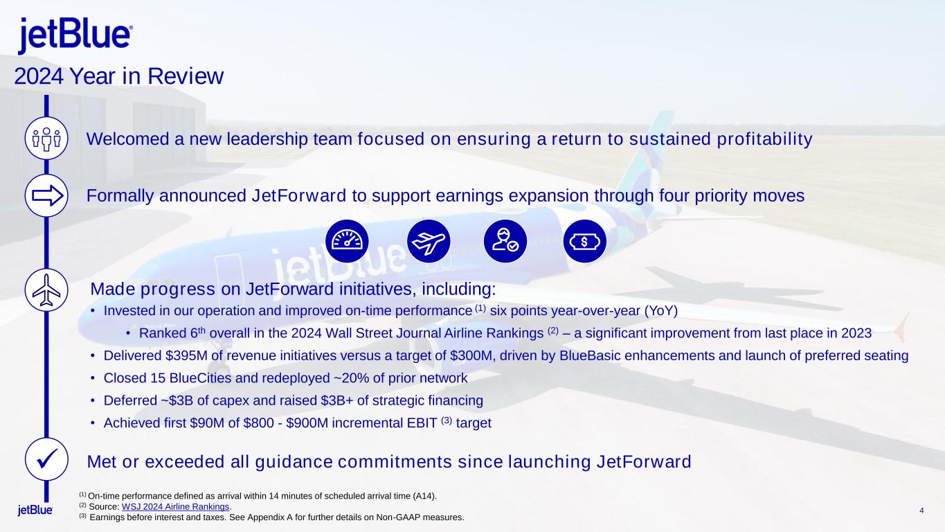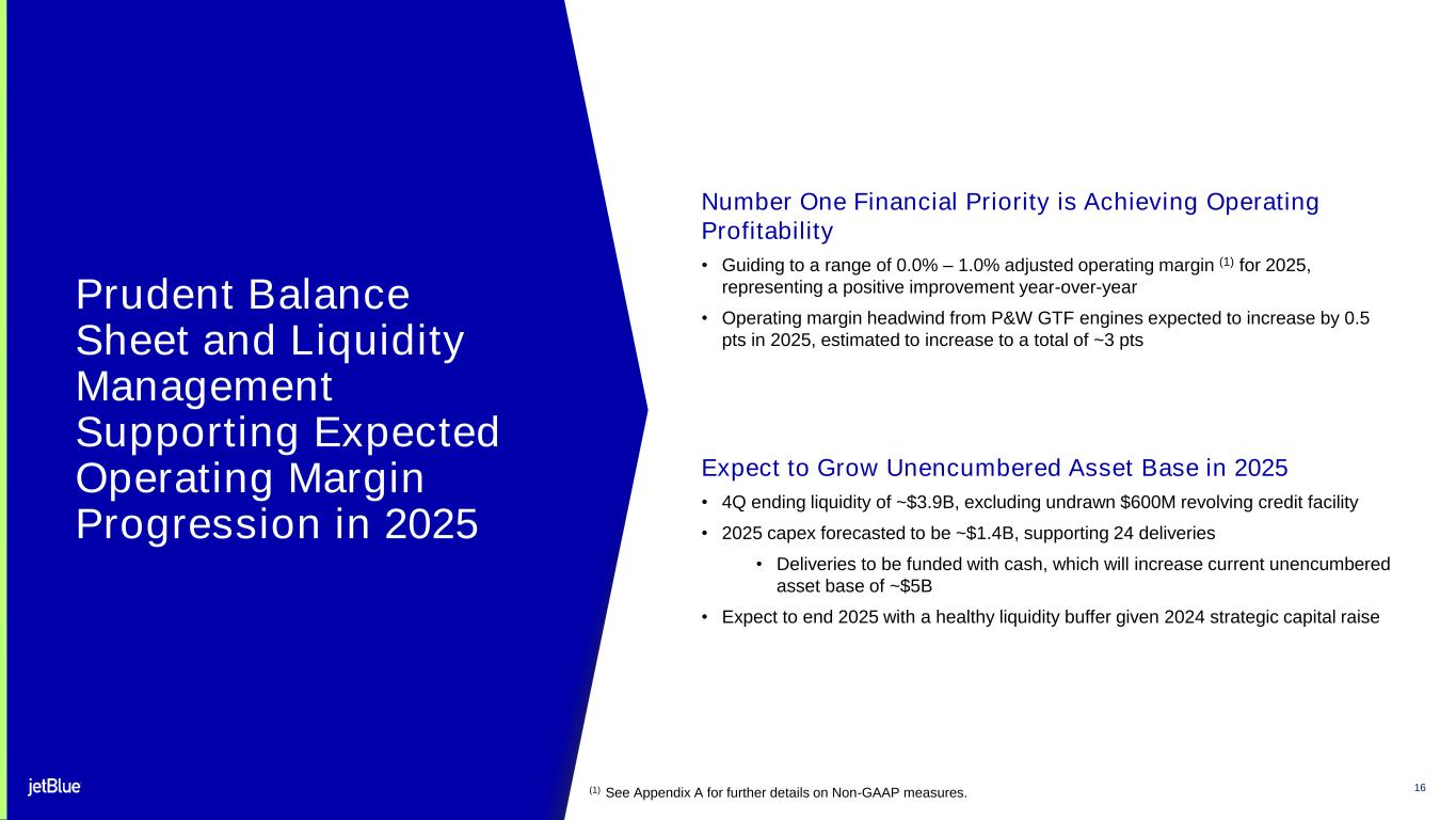"We have the right initiatives in place and solid momentum headed into 2025," said Marty St. George, JetBlue's president. "Our reliability initiatives are driving greater customer satisfaction and our network changes are in the early stages of ramp. Our efforts to expand and enhance our products and perks, including the loyalty initiatives we plan to launch in 2025, are resonating and deepening engagement with our core customers. We believe the culmination of these efforts will boost our revenue performance in 2025 to ultimately drive positive operating margin for the year."