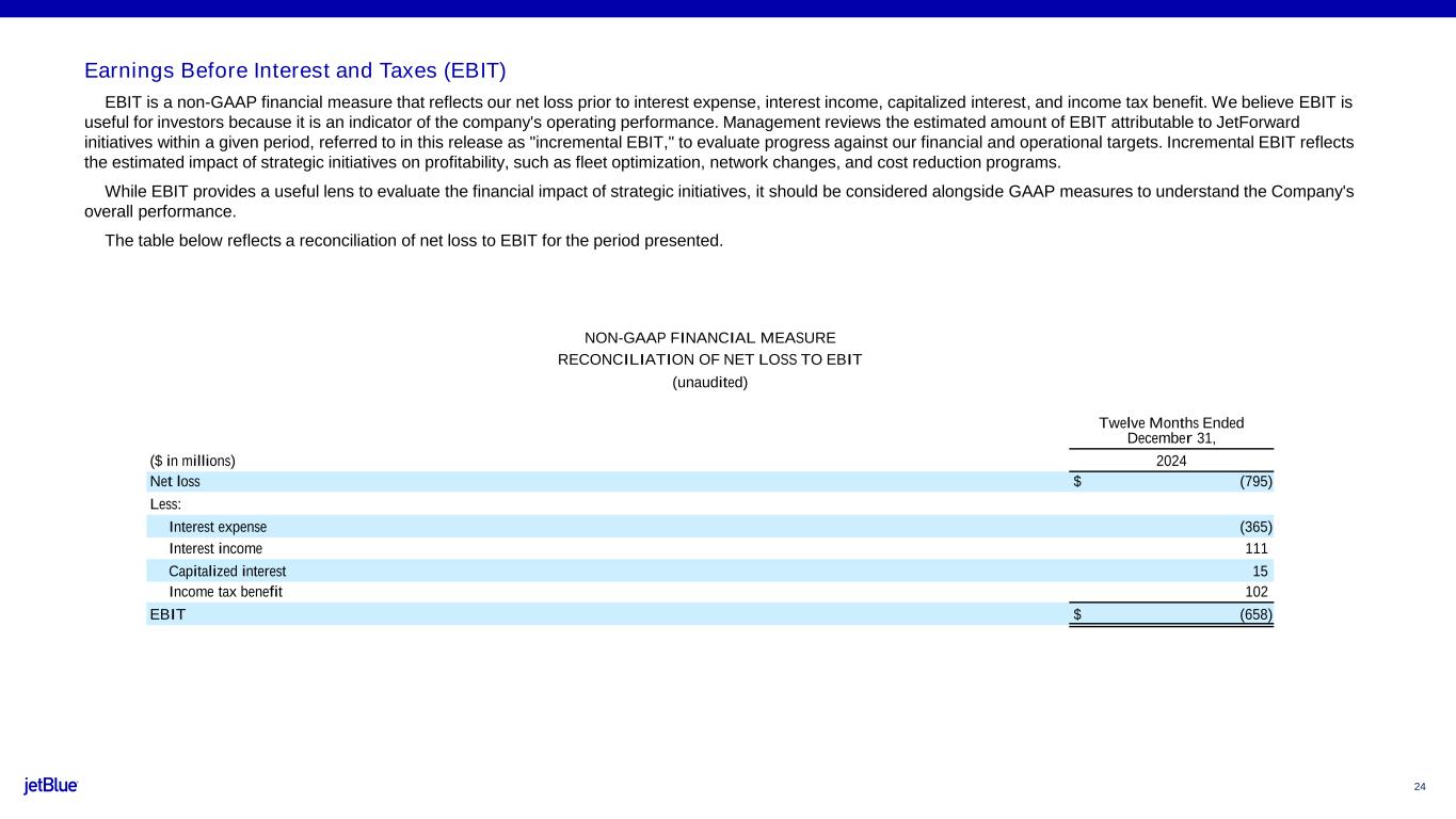 EBIT is a non-GAAP financial measure that reflects our net loss prior to interest expense, interest income, capitalized interest, and income tax benefit. We believe EBIT is useful for investors because it is an indicator of the company's operating performance. Management reviews the estimated amount of EBIT attributable to JetForward initiatives within a given period, referred to in this release as "incremental EBIT," to evaluate progress against our financial and operational targets. Incremental EBIT reflects the estimated impact of strategic initiatives on profitability, such as fleet optimization, network changes, and cost reduction programs.