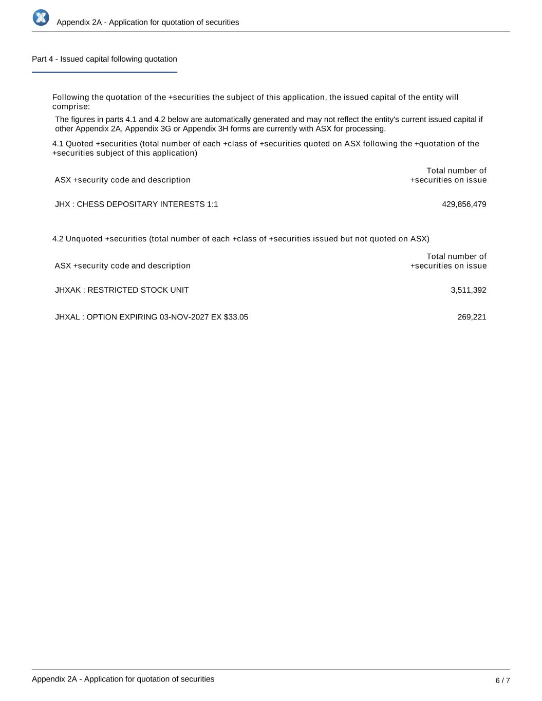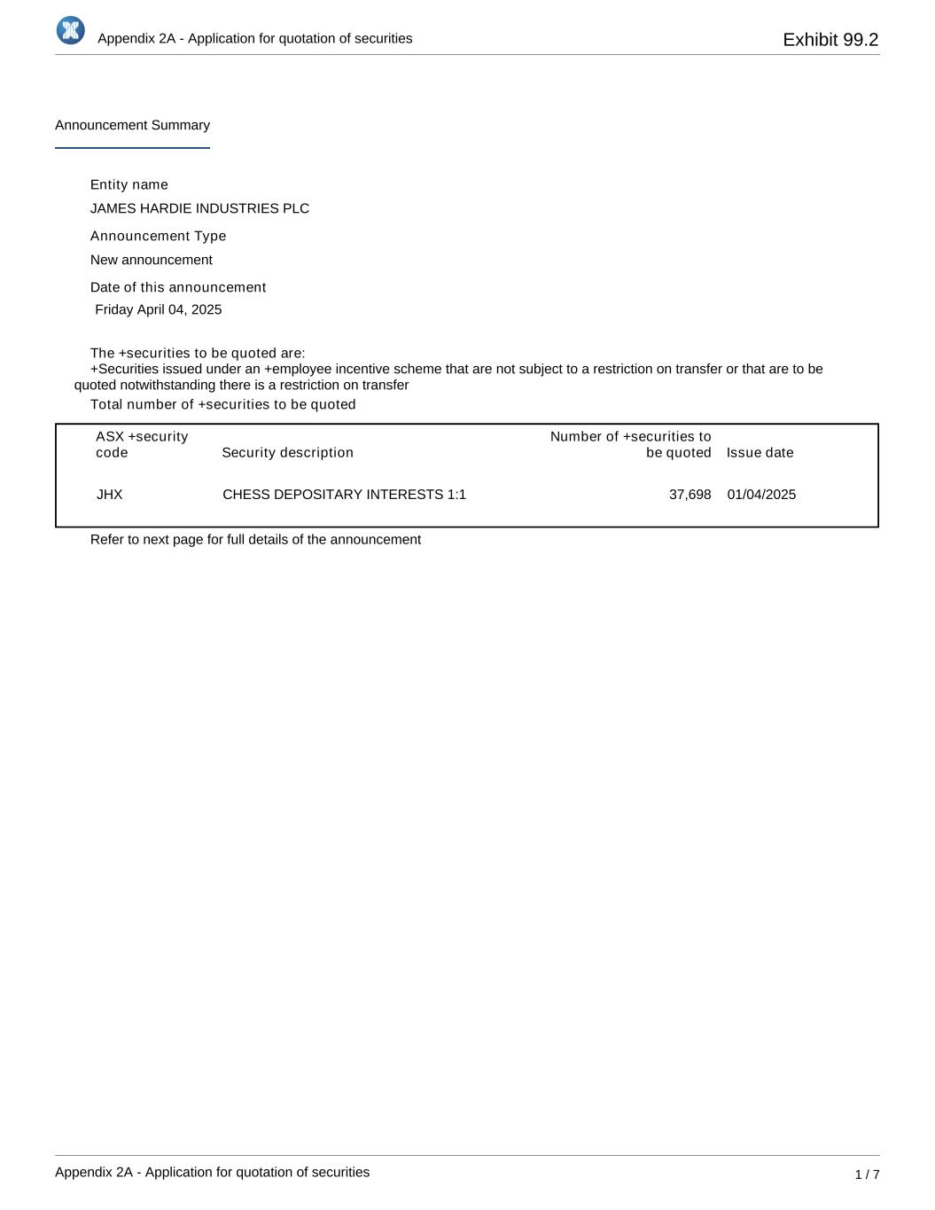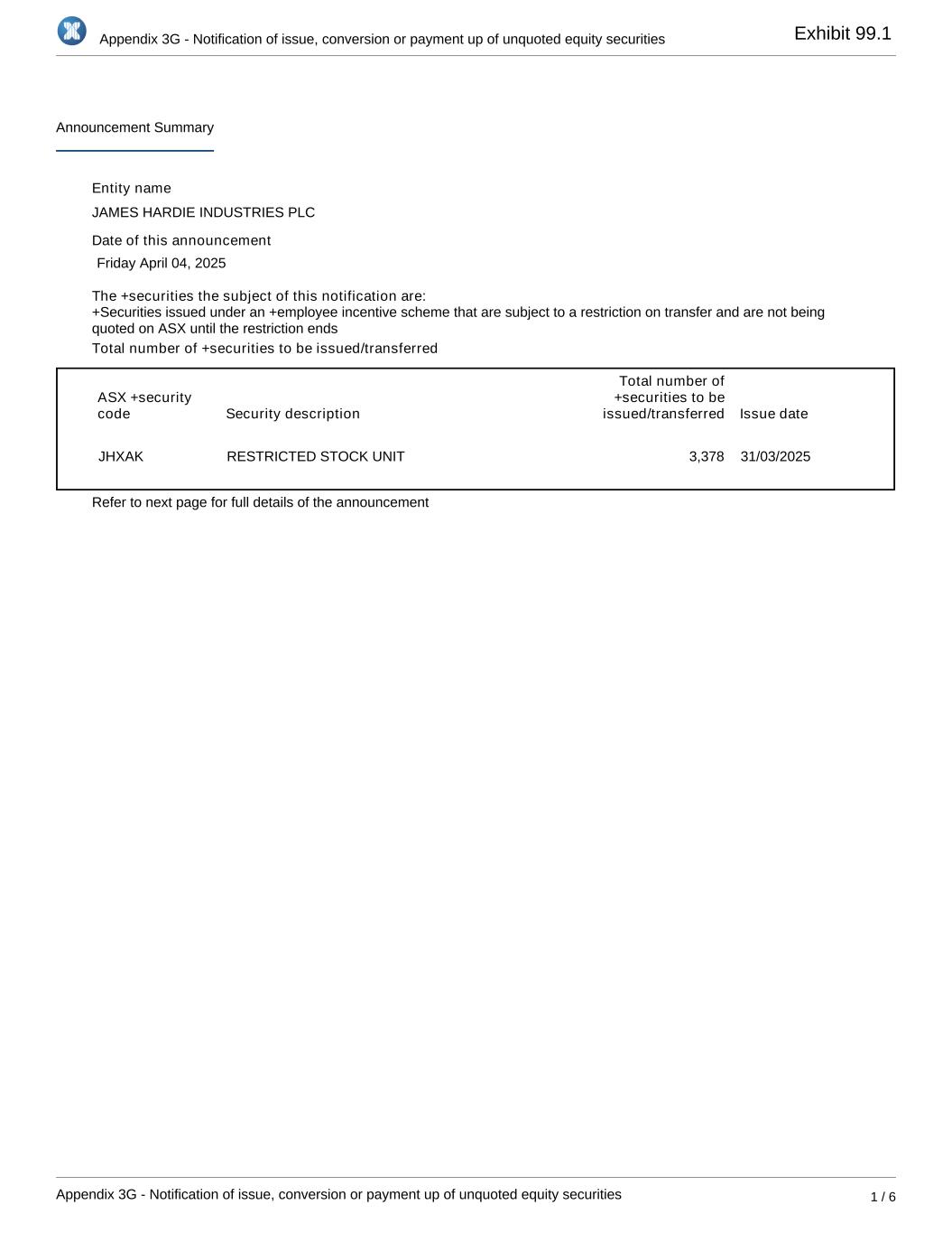 Forward-looking statements are based on the Company’s current expectations, estimates and assumptions and because forward-looking statements address future results, events and conditions, they, by their very nature, involve inherent risks and uncertainties, many of which are unforeseeable and beyond the Company’s control. Such known and unknown risks, uncertainties and other factors may cause actual results, performance or other achievements to differ materially from the anticipated results, performance or achievements expressed, projected or implied by these forward-looking statements. These factors, some of which are discussed under “Risk Factors” in Section 3 of the Form 20-F filed with the Securities and Exchange Commission on 20 May 2024, include, but are not limited to: all matters relating to or arising out of the prior manufacture of products that contained asbestos by current and former Company subsidiaries; required contributions to AICF, any shortfall in AICF funding and the effect of currency exchange rate movements on the amount recorded in the Company’s financial statements as an asbestos liability; compliance with and changes in tax laws and treatments; competition and product pricing in the markets in which the Company operates; the consequences of product failures or defects; exposure to environmental, asbestos, putative consumer class action or other legal proceedings; general economic and market conditions; the supply and cost of raw materials; possible increases in competition and the potential that competitors could copy the Company’s products; compliance with and changes in environmental and health and safety laws; risks of conducting business internationally; compliance with and changes in laws and regulations; currency exchange risks; dependence on customer preference and the concentration of the Company’s customer base; dependence on residential and commercial construction markets; the effect of adverse changes in climate or weather patterns; use of accounting estimates; and all other risks identified in the Company’s reports filed with Australian, Irish and US securities regulatory agencies and exchanges (as appropriate). The Company cautions you that the foregoing list of factors is not exhaustive and that other risks and uncertainties may cause actual results to differ materially from those referenced in the Company’s forward-looking statements. Forward-looking statements speak only as of the date they are made and are statements of the Company’s current expectations concerning future results, events and conditions. The Company assumes no obligation to update any forward-looking statements or information except as required by law.