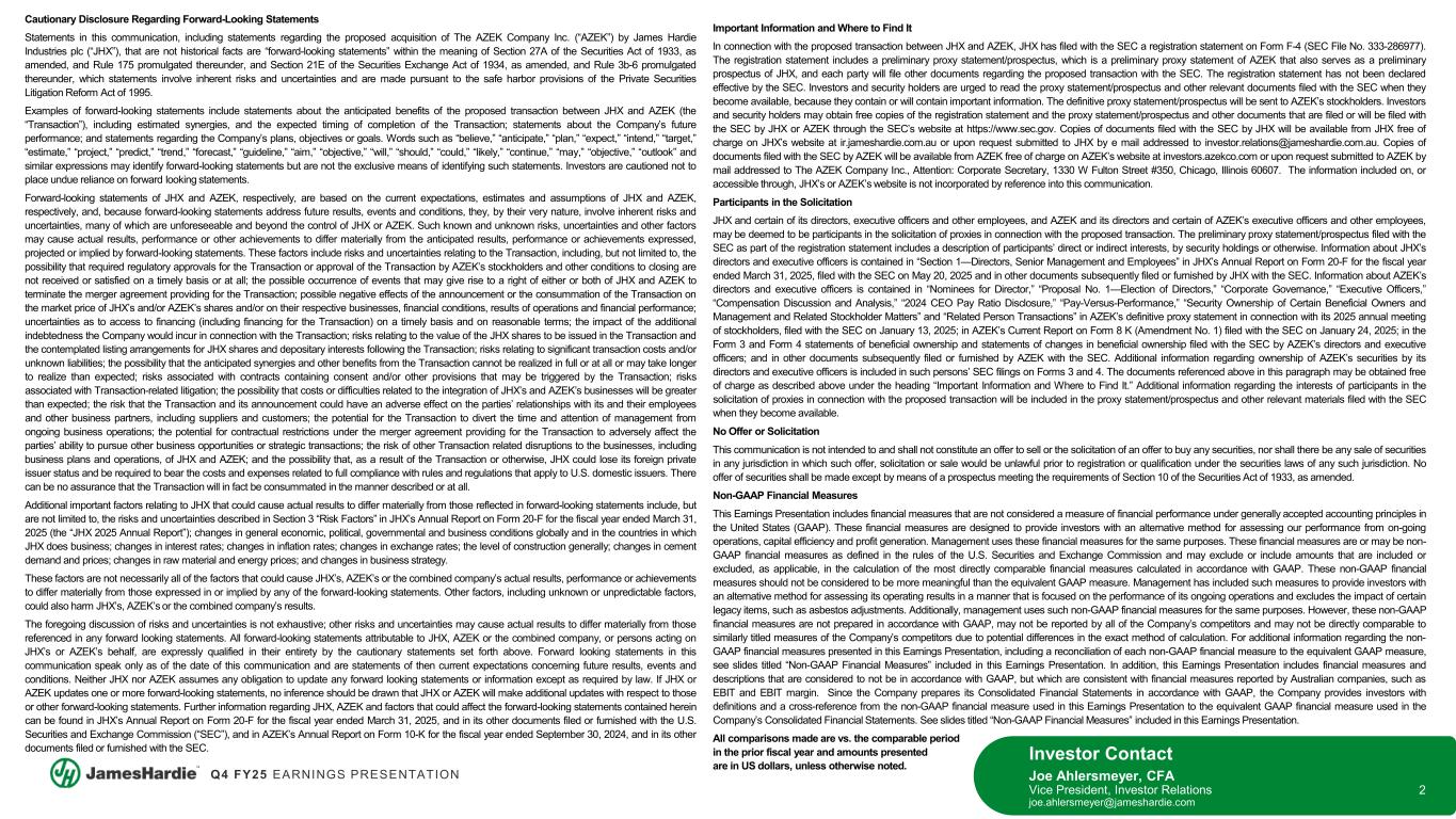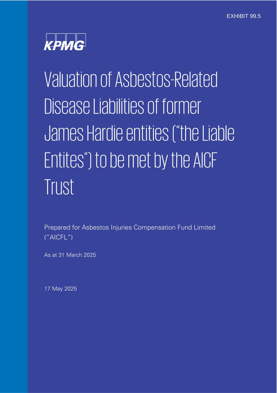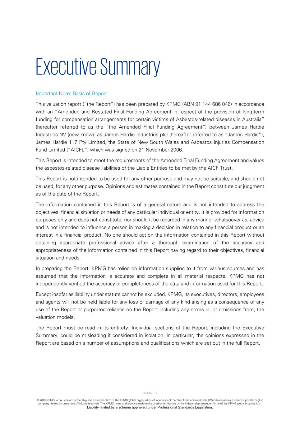 KPMG | i © 2025 KPMG, an Australian partnership and a member firm of the KPMG global organisation of independent member firms affiliated with KPMG International Limited, a private English company limited by guarantee. All rights reserved. The KPMG name and logo are trademarks used under license by the independent member firms of the KPMG global organisation. Liability limited by a scheme approved under Professional Standards Legislation. Executive Summary Important Note: Basis of Report This valuation report (“the Report”) has been prepared by KPMG (ABN 91 144 686 046) in accordance with an “Amended and Restated Final Funding Agreement in respect of the provision of long-term funding for compensation arrangements for certain victims of Asbestos-related diseases in Australia” (hereafter referred to as the “the Amended Final Funding Agreement”) between James Hardie Industries NV (now known as James Hardie Industries plc) (hereafter referred to as “James Hardie”), James Hardie 117 Pty Limited, the State of New South Wales and Asbestos Injuries Compensation Fund Limited (“AICFL”) which was signed on 21 November 2006. This Report is intended to meet the requirements of the Amended Final Funding Agreement and values the asbestos-related disease liabilities of the Liable Entities to be met by the AICF Trust. This Report is not intended to be used for any other purpose and may not be suitable, and should not be used, for any other purpose. Opinions and estimates contained in the Report constitute our judgment as of the date of the Report. The information contained in this Report is of a general nature and is not intended to address the objectives, financial situation or needs of any particular individual or entity. It is provided for information purposes only and does not constitute, nor should it be regarded in any manner whatsoever as, advice and is not intended to influence a person in making a decision in relation to any financial product or an interest in a financial product. No one should act on the information contained in this Report without obtaining appropriate professional advice after a thorough examination of the accuracy and appropriateness of the information contained in this Report having regard to their objectives, financial situation and needs. In preparing the Report, KPMG has relied on information supplied to it from various sources and has assumed that the information is accurate and complete in all material respects. KPMG has not independently verified the accuracy or completeness of the data and information used for this Report. Except insofar as liability under statute cannot be excluded, KPMG, its executives, directors, employees and agents will not be held liable for any loss or damage of any kind arising as a consequence of any use of the Report or purported reliance on the Report including any errors in, or omissions from, the valuation models. The Report must be read in its entirety. Individual sections of the Report, including the Executive Summary, could be misleading if considered in isolation. In particular, the opinions expressed in the Report are based on a number of assumptions and qualifications which are set out in the full Report.