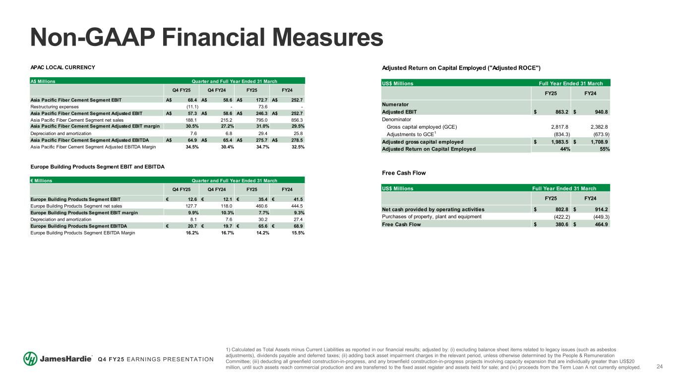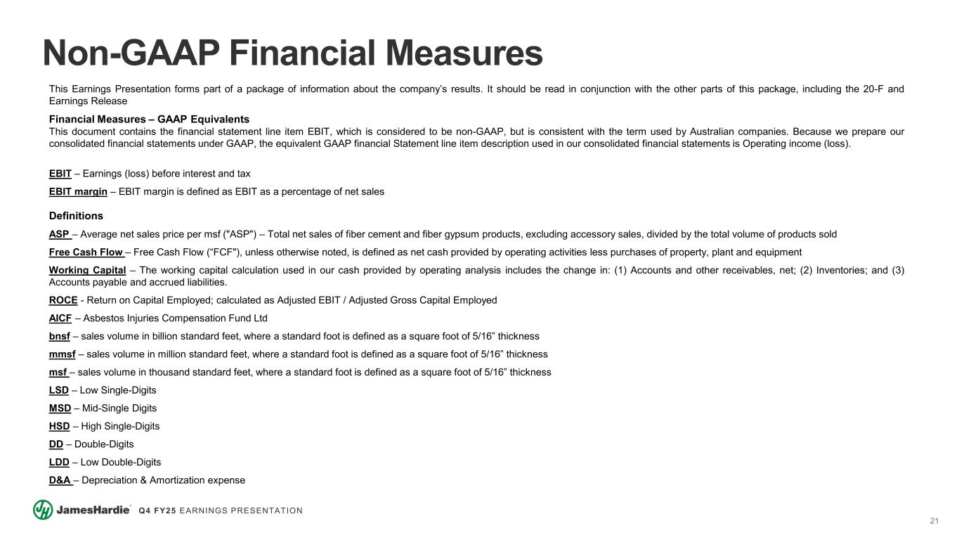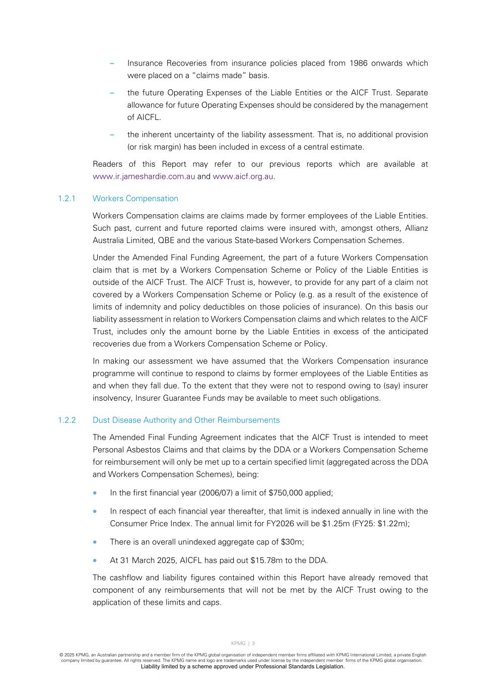 KPMG | 3 © 2025 KPMG, an Australian partnership and a member firm of the KPMG global organisation of independent member firms affiliated with KPMG International Limited, a private English company limited by guarantee. All rights reserved. The KPMG name and logo are trademarks used under license by the independent member firms of the KPMG global organisation. Liability limited by a scheme approved under Professional Standards Legislation. – Insurance Recoveries from insurance policies placed from 1986 onwards which were placed on a “claims made” basis. – the future Operating Expenses of the Liable Entities or the AICF Trust. Separate allowance for future Operating Expenses should be considered by the management of AICFL. – the inherent uncertainty of the liability assessment. That is, no additional provision (or risk margin) has been included in excess of a central estimate. Readers of this Report may refer to our previous reports which are available at www.ir.jameshardie.com.au and www.aicf.org.au. 1.2.1 Workers Compensation Workers Compensation claims are claims made by former employees of the Liable Entities. Such past, current and future reported claims were insured with, amongst others, Allianz Australia Limited, QBE and the various State-based Workers Compensation Schemes. Under the Amended Final Funding Agreement, the part of a future Workers Compensation claim that is met by a Workers Compensation Scheme or Policy of the Liable Entities is outside of the AICF Trust. The AICF Trust is, however, to provide for any part of a claim not covered by a Workers Compensation Scheme or Policy (e.g. as a result of the existence of limits of indemnity and policy deductibles on those policies of insurance). On this basis our liability assessment in relation to Workers Compensation claims and which relates to the AICF Trust, includes only the amount borne by the Liable Entities in excess of the anticipated recoveries due from a Workers Compensation Scheme or Policy. In making our assessment we have assumed that the Workers Compensation insurance programme will continue to respond to claims by former employees of the Liable Entities as and when they fall due. To the extent that they were not to respond owing to (say) insurer insolvency, Insurer Guarantee Funds may be available to meet such obligations. 1.2.2 Dust Disease Authority and Other Reimbursements The Amended Final Funding Agreement indicates that the AICF Trust is intended to meet Personal Asbestos Claims and that claims by the DDA or a Workers Compensation Scheme for reimbursement will only be met up to a certain specified limit (aggregated across the DDA and Workers Compensation Schemes), being: • In the first financial year (2006/07) a limit of $750,000 applied; • In respect of each financial year thereafter, that limit is indexed annually in line with the Consumer Price Index. The annual limit for FY2026 will be $1.25m (FY25: $1.22m); • There is an overall unindexed aggregate cap of $30m; • At 31 March 2025, AICFL has paid out $15.78m to the DDA. The cashflow and liability figures contained within this Report have already removed that component of any reimbursements that will not be met by the AICF Trust owing to the application of these limits and caps.