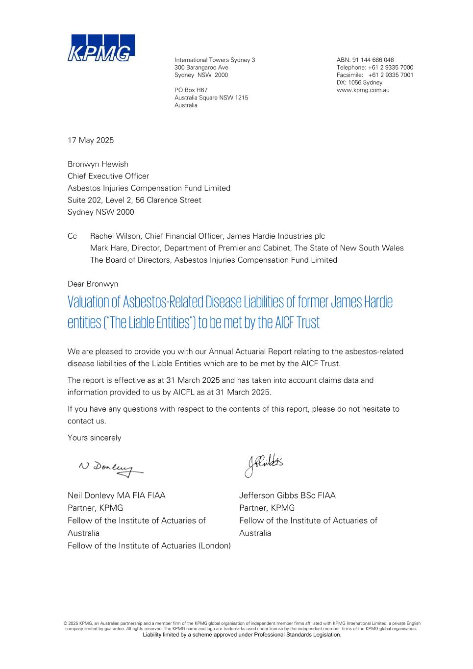 © 2025 KPMG, an Australian partnership and a member firm of the KPMG global organisation of independent member firms affiliated with KPMG International Limited, a private English company limited by guarantee. All rights reserved. The KPMG name and logo are trademarks used under license by the independent member firms of the KPMG global organisation. Liability limited by a scheme approved under Professional Standards Legislation. International Towers Sydney 3 300 Barangaroo Ave Sydney NSW 2000 PO Box H67 Australia Square NSW 1215 Australia ABN: 91 144 686 046 Telephone: +61 2 9335 7000 Facsimile: +61 2 9335 7001 DX: 1056 Sydney www.kpmg.com.au 17 May 2025 Bronwyn Hewish Chief Executive Officer Asbestos Injuries Compensation Fund Limited Suite 202, Level 2, 56 Clarence Street Sydney NSW 2000 Cc Rachel Wilson, Chief Financial Officer, James Hardie Industries plc Mark Hare, Director, Department of Premier and Cabinet, The State of New South Wales The Board of Directors, Asbestos Injuries Compensation Fund Limited Dear Bronwyn Valuation of Asbestos-Related Disease Liabilities of former James Hardie entities (“The Liable Entities”) to be met by the AICF Trust We are pleased to provide you with our Annual Actuarial Report relating to the asbestos-related disease liabilities of the Liable Entities which are to be met by the AICF Trust. The report is effective as at 31 March 2025 and has taken into account claims data and information provided to us by AICFL as at 31 March 2025. If you have any questions with respect to the contents of this report, please do not hesitate to contact us. Yours sincerely Neil Donlevy MA FIA FIAA Jefferson Gibbs BSc FIAA Partner, KPMG Partner, KPMG Fellow of the Institute of Actuaries of Fellow of the Institute of Actuaries of Australia Australia Fellow of the Institute of Actuaries (London)