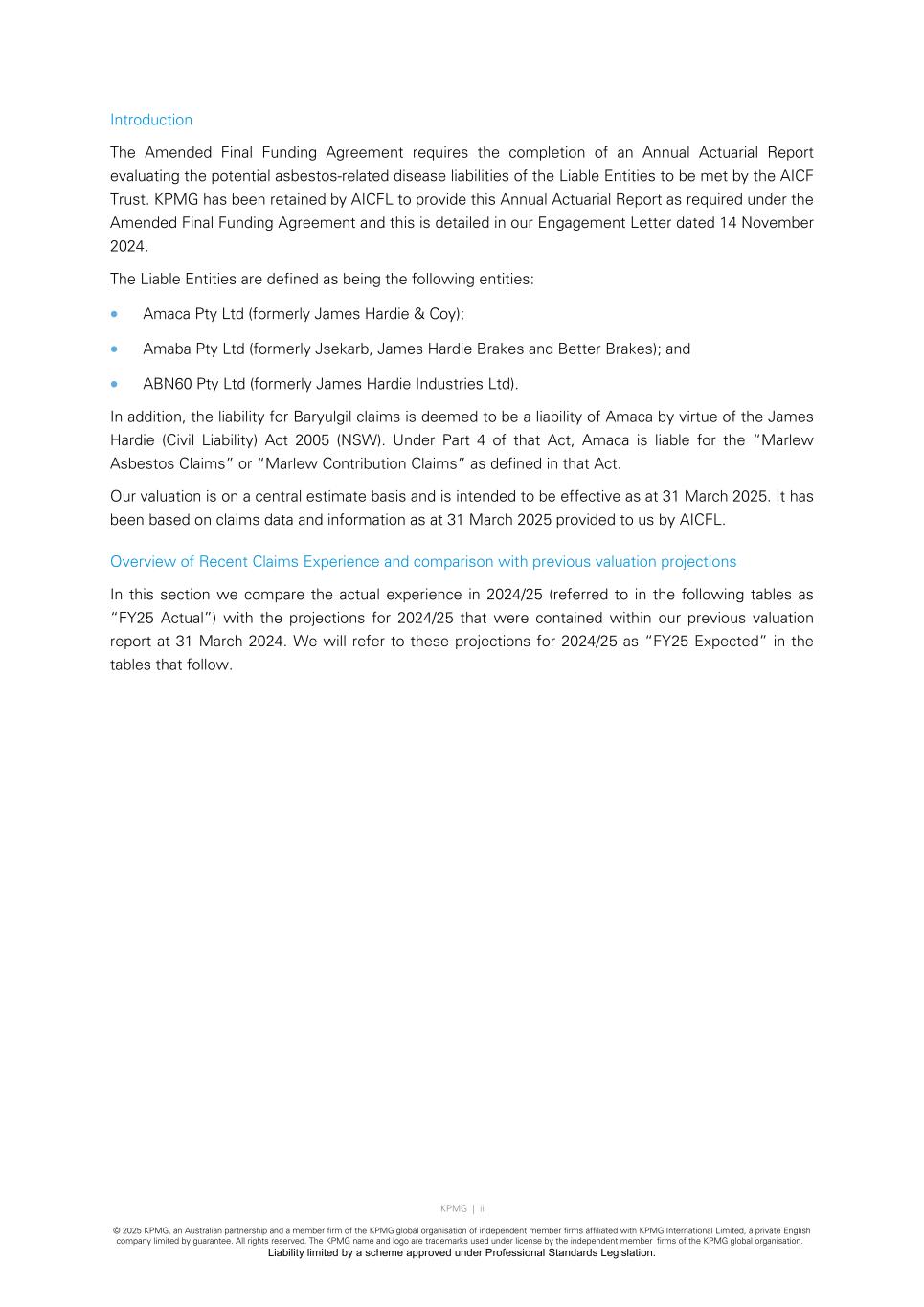 KPMG | ii © 2025 KPMG, an Australian partnership and a member firm of the KPMG global organisation of independent member firms affiliated with KPMG International Limited, a private English company limited by guarantee. All rights reserved. The KPMG name and logo are trademarks used under license by the independent member firms of the KPMG global organisation. Liability limited by a scheme approved under Professional Standards Legislation. Introduction The Amended Final Funding Agreement requires the completion of an Annual Actuarial Report evaluating the potential asbestos-related disease liabilities of the Liable Entities to be met by the AICF Trust. KPMG has been retained by AICFL to provide this Annual Actuarial Report as required under the Amended Final Funding Agreement and this is detailed in our Engagement Letter dated 14 November 2024. The Liable Entities are defined as being the following entities: • Amaca Pty Ltd (formerly James Hardie & Coy); • Amaba Pty Ltd (formerly Jsekarb, James Hardie Brakes and Better Brakes); and • ABN60 Pty Ltd (formerly James Hardie Industries Ltd). In addition, the liability for Baryulgil claims is deemed to be a liability of Amaca by virtue of the James Hardie (Civil Liability) Act 2005 (NSW). Under Part 4 of that Act, Amaca is liable for the “Marlew Asbestos Claims” or “Marlew Contribution Claims” as defined in that Act. Our valuation is on a central estimate basis and is intended to be effective as at 31 March 2025. It has been based on claims data and information as at 31 March 2025 provided to us by AICFL. Overview of Recent Claims Experience and comparison with previous valuation projections In this section we compare the actual experience in 2024/25 (referred to in the following tables as “FY25 Actual”) with the projections for 2024/25 that were contained within our previous valuation report at 31 March 2024. We will refer to these projections for 2024/25 as “FY25 Expected” in the tables that follow.