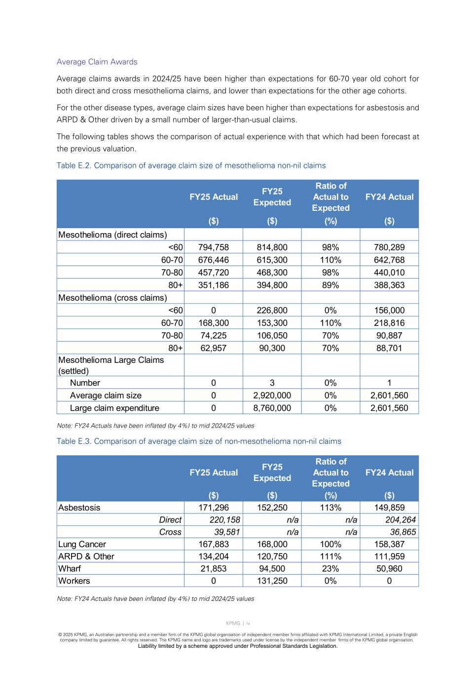 KPMG | iv © 2025 KPMG, an Australian partnership and a member firm of the KPMG global organisation of independent member firms affiliated with KPMG International Limited, a private English company limited by guarantee. All rights reserved. The KPMG name and logo are trademarks used under license by the independent member firms of the KPMG global organisation. Liability limited by a scheme approved under Professional Standards Legislation. Average Claim Awards Average claims awards in 2024/25 have been higher than expectations for 60-70 year old cohort for both direct and cross mesothelioma claims, and lower than expectations for the other age cohorts. For the other disease types, average claim sizes have been higher than expectations for asbestosis and ARPD & Other driven by a small number of larger-than-usual claims. The following tables shows the comparison of actual experience with that which had been forecast at the previous valuation. Table E.2. Comparison of average claim size of mesothelioma non-nil claims Note: FY24 Actuals have been inflated (by 4%) to mid 2024/25 values Table E.3. Comparison of average claim size of non-mesothelioma non-nil claims Note: FY24 Actuals have been inflated (by 4%) to mid 2024/25 values FY25 Actual FY25 Expected Ratio of Actual to Expected FY24 Actual ($) ($) (%) ($) Mesothelioma (direct claims) <60 794,758 814,800 98% 780,289 60-70 676,446 615,300 110% 642,768 70-80 457,720 468,300 98% 440,010 80+ 351,186 394,800 89% 388,363 Mesothelioma (cross claims) <60 0 226,800 0% 156,000 60-70 168,300 153,300 110% 218,816 70-80 74,225 106,050 70% 90,887 80+ 62,957 90,300 70% 88,701 Mesothelioma Large Claims (settled) Number 0 3 0% 1 Average claim size 0 2,920,000 0% 2,601,560 Large claim expenditure 0 8,760,000 0% 2,601,560 FY25 Actual FY25 Expected Ratio of Actual to Expected FY24 Actual ($) ($) (%) ($) Asbestosis 171,296 152,250 113% 149,859 Direct 220,158 n/a n/a 204,264 Cross 39,581 n/a n/a 36,865 Lung Cancer 167,883 168,000 100% 158,387 ARPD & Other 134,204 120,750 111% 111,959 Wharf 21,853 94,500 23% 50,960 Workers 0 131,250 0% 0
