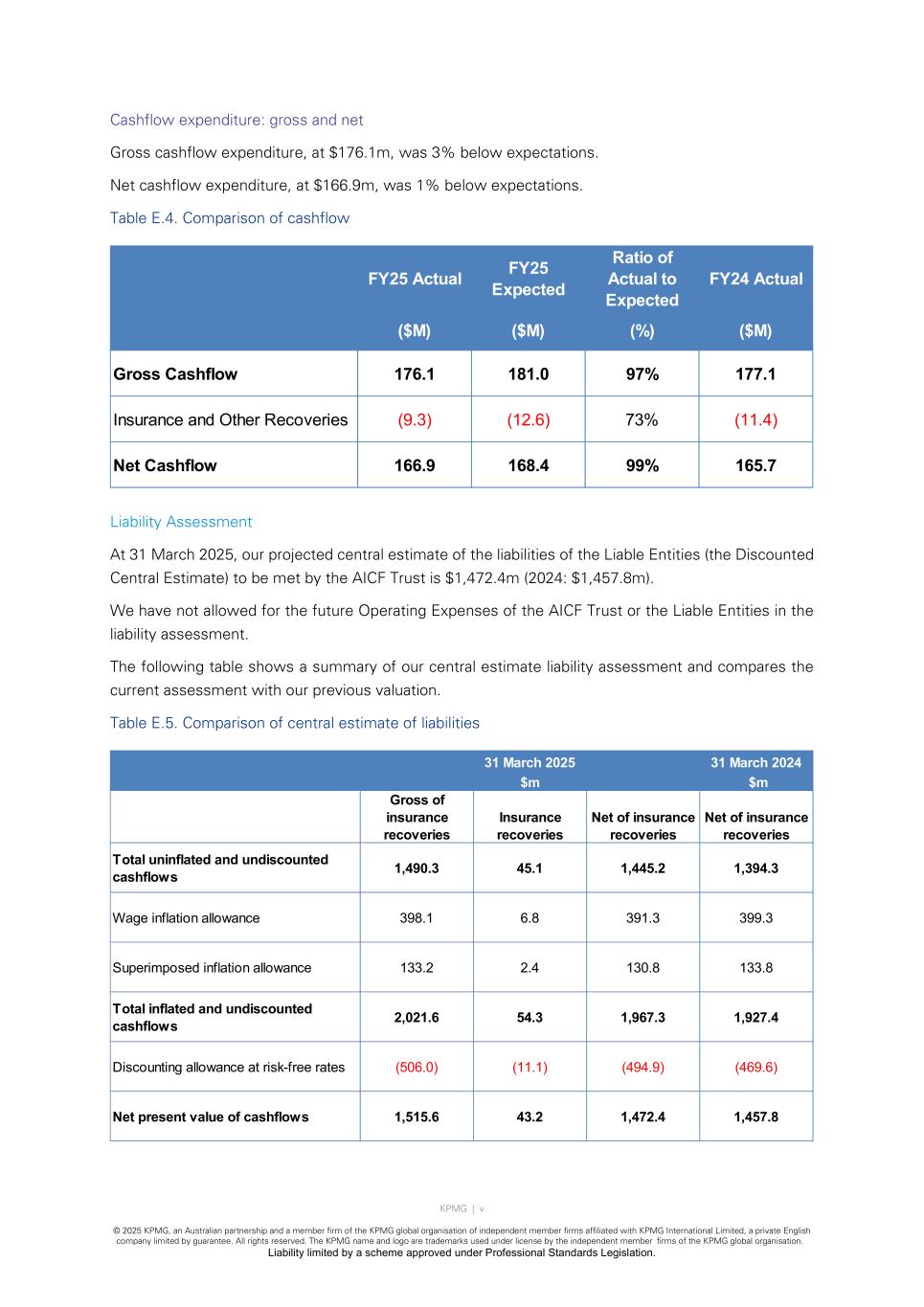 KPMG | v © 2025 KPMG, an Australian partnership and a member firm of the KPMG global organisation of independent member firms affiliated with KPMG International Limited, a private English company limited by guarantee. All rights reserved. The KPMG name and logo are trademarks used under license by the independent member firms of the KPMG global organisation. Liability limited by a scheme approved under Professional Standards Legislation. Cashflow expenditure: gross and net Gross cashflow expenditure, at $176.1m, was 3% below expectations. Net cashflow expenditure, at $166.9m, was 1% below expectations. Table E.4. Comparison of cashflow Liability Assessment At 31 March 2025, our projected central estimate of the liabilities of the Liable Entities (the Discounted Central Estimate) to be met by the AICF Trust is $1,472.4m (2024: $1,457.8m). We have not allowed for the future Operating Expenses of the AICF Trust or the Liable Entities in the liability assessment. The following table shows a summary of our central estimate liability assessment and compares the current assessment with our previous valuation. Table E.5. Comparison of central estimate of liabilities FY25 Actual FY25 Expected Ratio of Actual to Expected FY24 Actual ($M) ($M) (%) ($M) Gross Cashflow 176.1 181.0 97% 177.1 Insurance and Other Recoveries (9.3) (12.6) 73% (11.4) Net Cashflow 166.9 168.4 99% 165.7 31 March 2024 $m Gross of insurance recoveries Insurance recoveries Net of insurance recoveries Net of insurance recoveries Total uninflated and undiscounted cashflows 1,490.3 45.1 1,445.2 1,394.3 Wage inflation allowance 398.1 6.8 391.3 399.3 Superimposed inflation allowance 133.2 2.4 130.8 133.8 Total inflated and undiscounted cashflows 2,021.6 54.3 1,967.3 1,927.4 Discounting allowance at risk-free rates (506.0) (11.1) (494.9) (469.6) Net present value of cashflows 1,515.6 43.2 1,472.4 1,457.8 31 March 2025 $m
