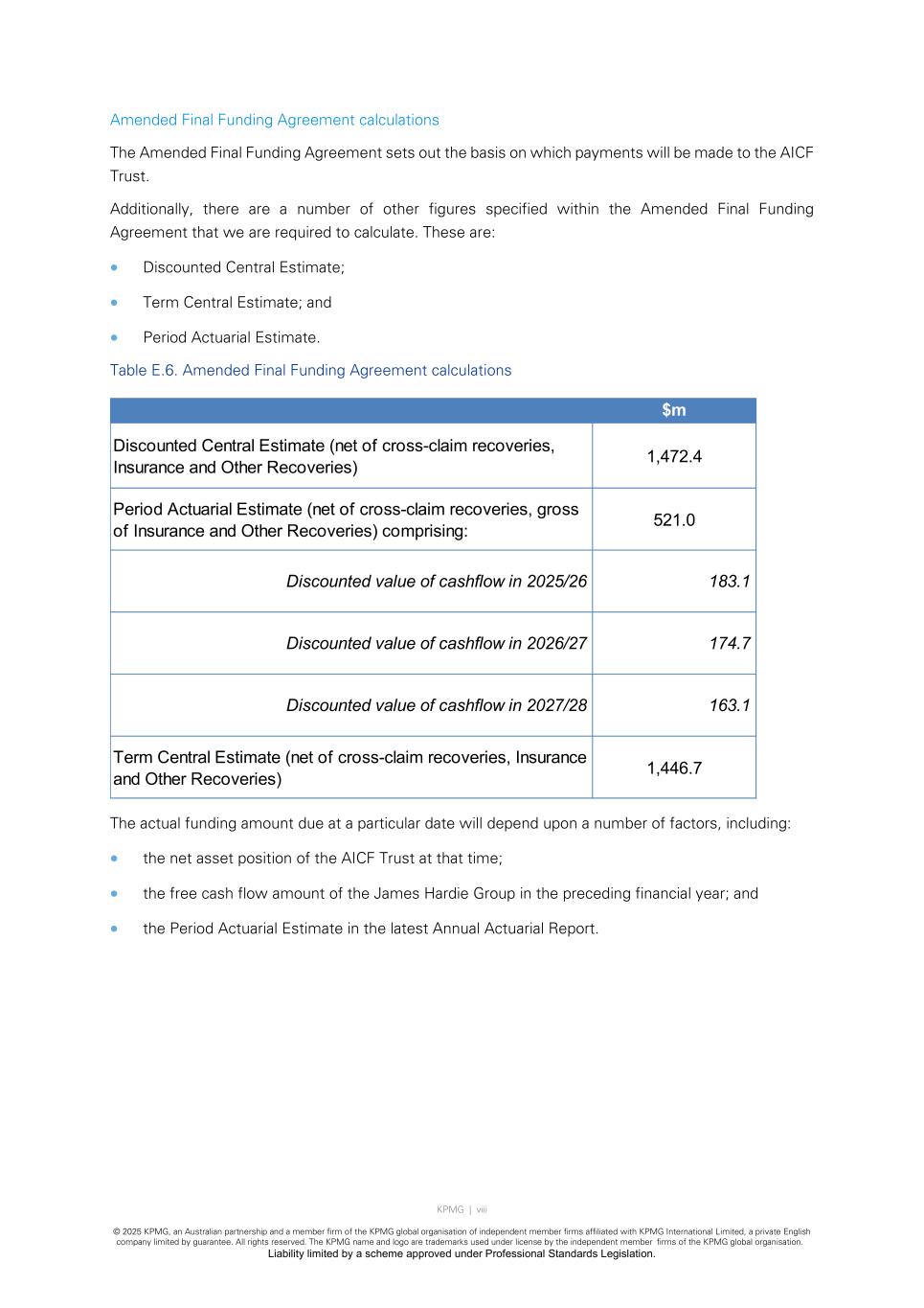 KPMG | viii © 2025 KPMG, an Australian partnership and a member firm of the KPMG global organisation of independent member firms affiliated with KPMG International Limited, a private English company limited by guarantee. All rights reserved. The KPMG name and logo are trademarks used under license by the independent member firms of the KPMG global organisation. Liability limited by a scheme approved under Professional Standards Legislation. Amended Final Funding Agreement calculations The Amended Final Funding Agreement sets out the basis on which payments will be made to the AICF Trust. Additionally, there are a number of other figures specified within the Amended Final Funding Agreement that we are required to calculate. These are: • Discounted Central Estimate; • Term Central Estimate; and • Period Actuarial Estimate. Table E.6. Amended Final Funding Agreement calculations The actual funding amount due at a particular date will depend upon a number of factors, including: • the net asset position of the AICF Trust at that time; • the free cash flow amount of the James Hardie Group in the preceding financial year; and • the Period Actuarial Estimate in the latest Annual Actuarial Report. $m Discounted Central Estimate (net of cross-claim recoveries, Insurance and Other Recoveries) 1,472.4 Period Actuarial Estimate (net of cross-claim recoveries, gross of Insurance and Other Recoveries) comprising: 521.0 Discounted value of cashflow in 2025/26 183.1 Discounted value of cashflow in 2026/27 174.7 Discounted value of cashflow in 2027/28 163.1 Term Central Estimate (net of cross-claim recoveries, Insurance and Other Recoveries) 1,446.7