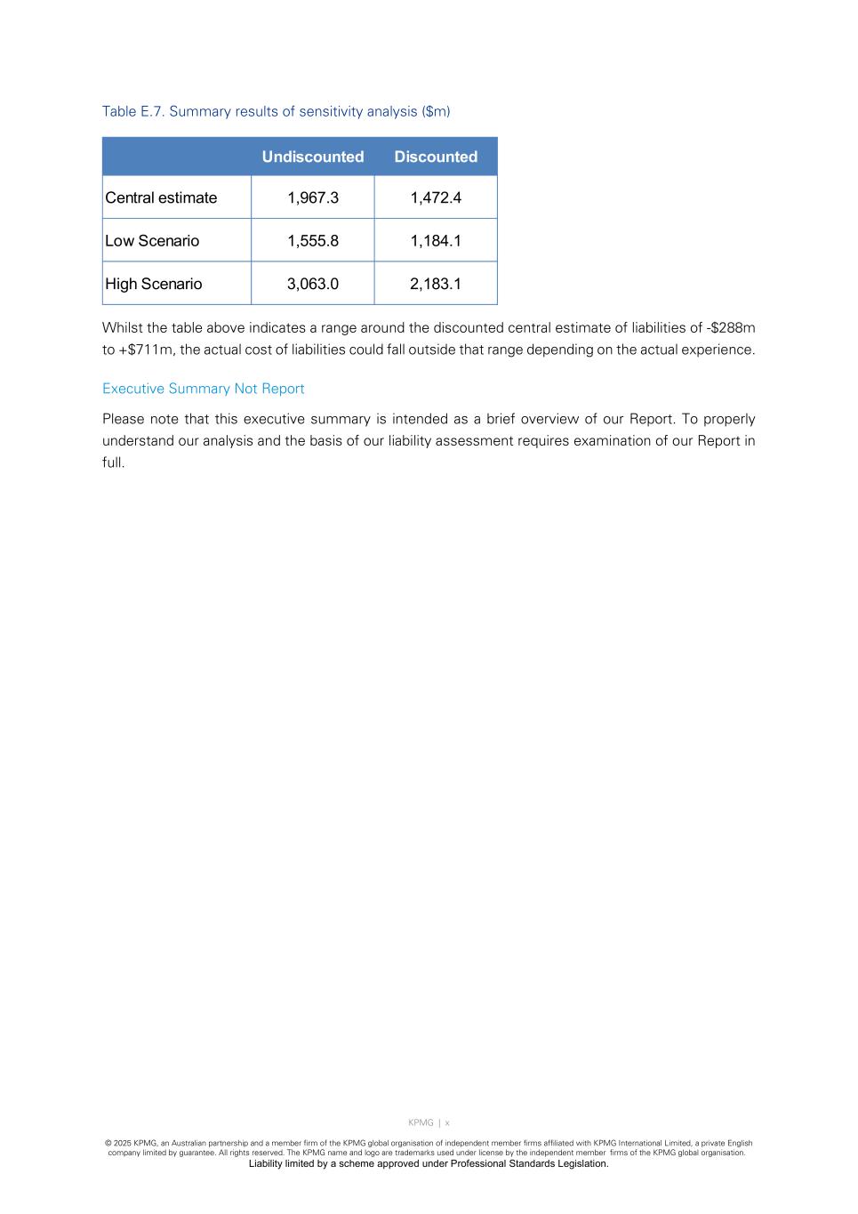 KPMG | x © 2025 KPMG, an Australian partnership and a member firm of the KPMG global organisation of independent member firms affiliated with KPMG International Limited, a private English company limited by guarantee. All rights reserved. The KPMG name and logo are trademarks used under license by the independent member firms of the KPMG global organisation. Liability limited by a scheme approved under Professional Standards Legislation. Table E.7. Summary results of sensitivity analysis ($m) Whilst the table above indicates a range around the discounted central estimate of liabilities of -$288m to +$711m, the actual cost of liabilities could fall outside that range depending on the actual experience. Executive Summary Not Report Please note that this executive summary is intended as a brief overview of our Report. To properly understand our analysis and the basis of our liability assessment requires examination of our Report in full. Undiscounted Discounted Central estimate 1,967.3 1,472.4 Low Scenario 1,555.8 1,184.1 High Scenario 3,063.0 2,183.1