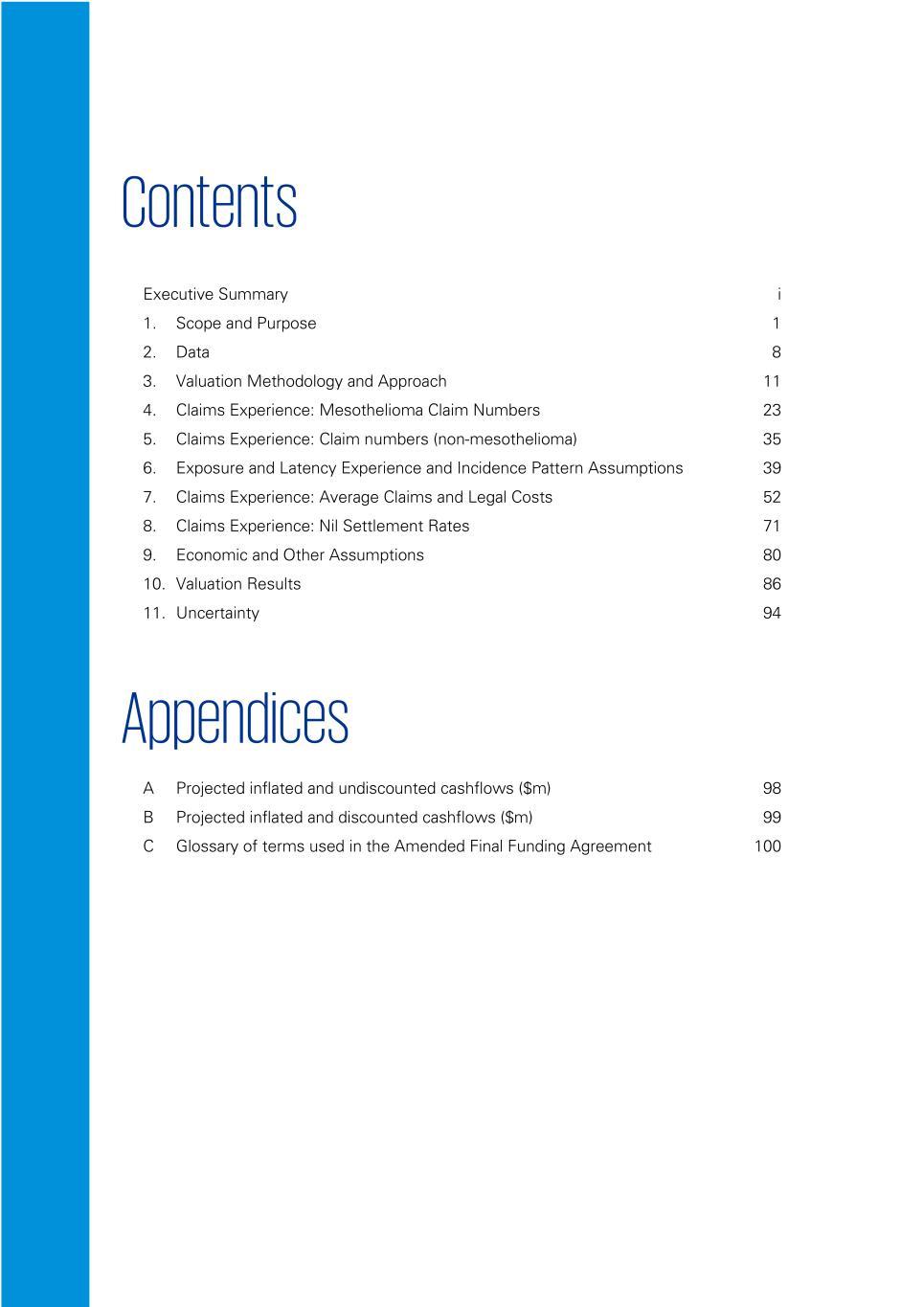 Contents Executive Summary i 1. Scope and Purpose 1 2. Data 8 3. Valuation Methodology and Approach 11 4. Claims Experience: Mesothelioma Claim Numbers 23 5. Claims Experience: Claim numbers (non-mesothelioma) 35 6. Exposure and Latency Experience and Incidence Pattern Assumptions 39 7. Claims Experience: Average Claims and Legal Costs 52 8. Claims Experience: Nil Settlement Rates 71 9. Economic and Other Assumptions 80 10. Valuation Results 86 11. Uncertainty 94 Appendices A Projected inflated and undiscounted cashflows ($m) 98 B Projected inflated and discounted cashflows ($m) 99 C Glossary of terms used in the Amended Final Funding Agreement 100