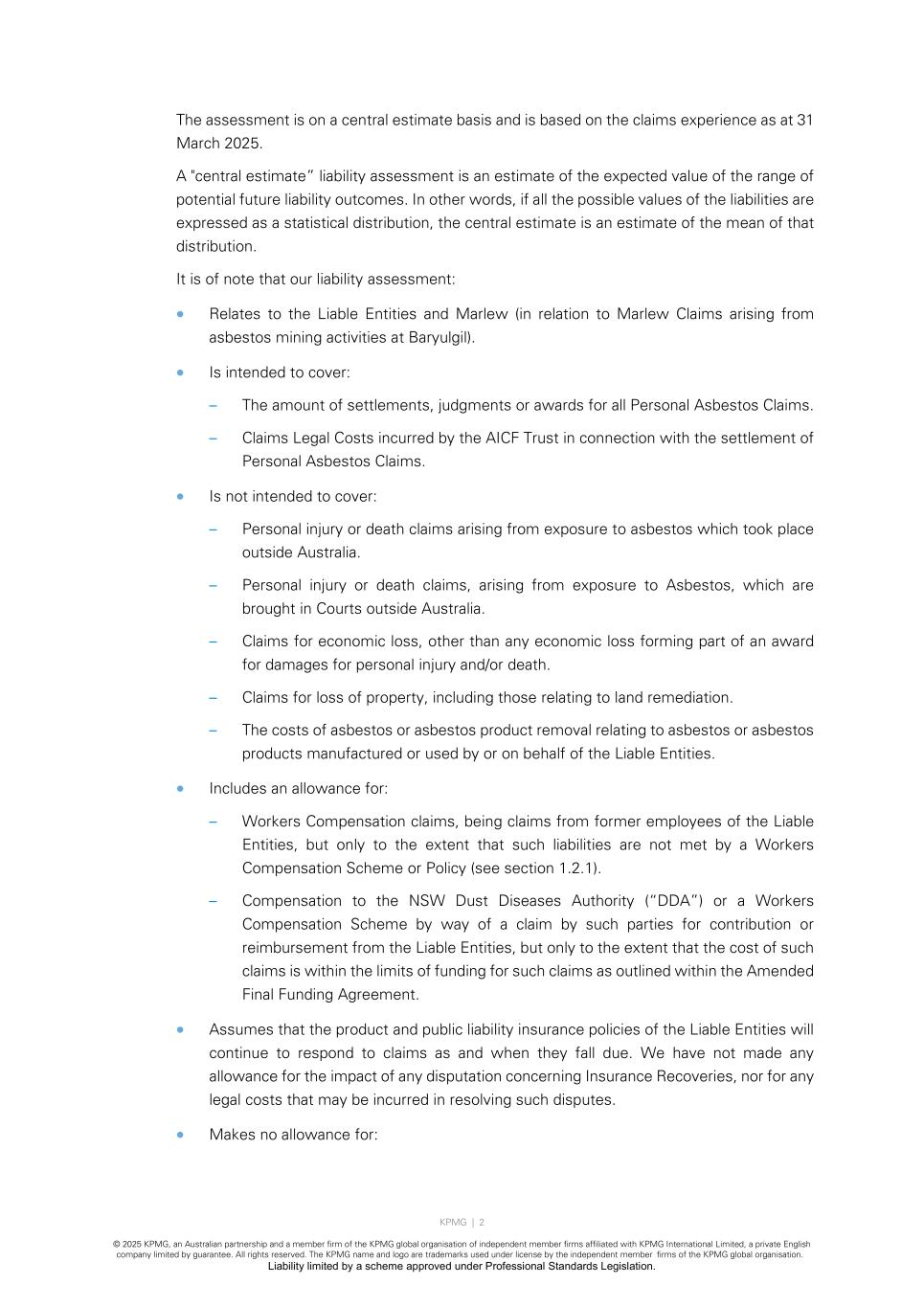 KPMG | 2 © 2025 KPMG, an Australian partnership and a member firm of the KPMG global organisation of independent member firms affiliated with KPMG International Limited, a private English company limited by guarantee. All rights reserved. The KPMG name and logo are trademarks used under license by the independent member firms of the KPMG global organisation. Liability limited by a scheme approved under Professional Standards Legislation. The assessment is on a central estimate basis and is based on the claims experience as at 31 March 2025. A "central estimate” liability assessment is an estimate of the expected value of the range of potential future liability outcomes. In other words, if all the possible values of the liabilities are expressed as a statistical distribution, the central estimate is an estimate of the mean of that distribution. It is of note that our liability assessment: • Relates to the Liable Entities and Marlew (in relation to Marlew Claims arising from asbestos mining activities at Baryulgil). • Is intended to cover: – The amount of settlements, judgments or awards for all Personal Asbestos Claims. – Claims Legal Costs incurred by the AICF Trust in connection with the settlement of Personal Asbestos Claims. • Is not intended to cover: – Personal injury or death claims arising from exposure to asbestos which took place outside Australia. – Personal injury or death claims, arising from exposure to Asbestos, which are brought in Courts outside Australia. – Claims for economic loss, other than any economic loss forming part of an award for damages for personal injury and/or death. – Claims for loss of property, including those relating to land remediation. – The costs of asbestos or asbestos product removal relating to asbestos or asbestos products manufactured or used by or on behalf of the Liable Entities. • Includes an allowance for: – Workers Compensation claims, being claims from former employees of the Liable Entities, but only to the extent that such liabilities are not met by a Workers Compensation Scheme or Policy (see section 1.2.1). – Compensation to the NSW Dust Diseases Authority (“DDA”) or a Workers Compensation Scheme by way of a claim by such parties for contribution or reimbursement from the Liable Entities, but only to the extent that the cost of such claims is within the limits of funding for such claims as outlined within the Amended Final Funding Agreement. • Assumes that the product and public liability insurance policies of the Liable Entities will continue to respond to claims as and when they fall due. We have not made any allowance for the impact of any disputation concerning Insurance Recoveries, nor for any legal costs that may be incurred in resolving such disputes. • Makes no allowance for: