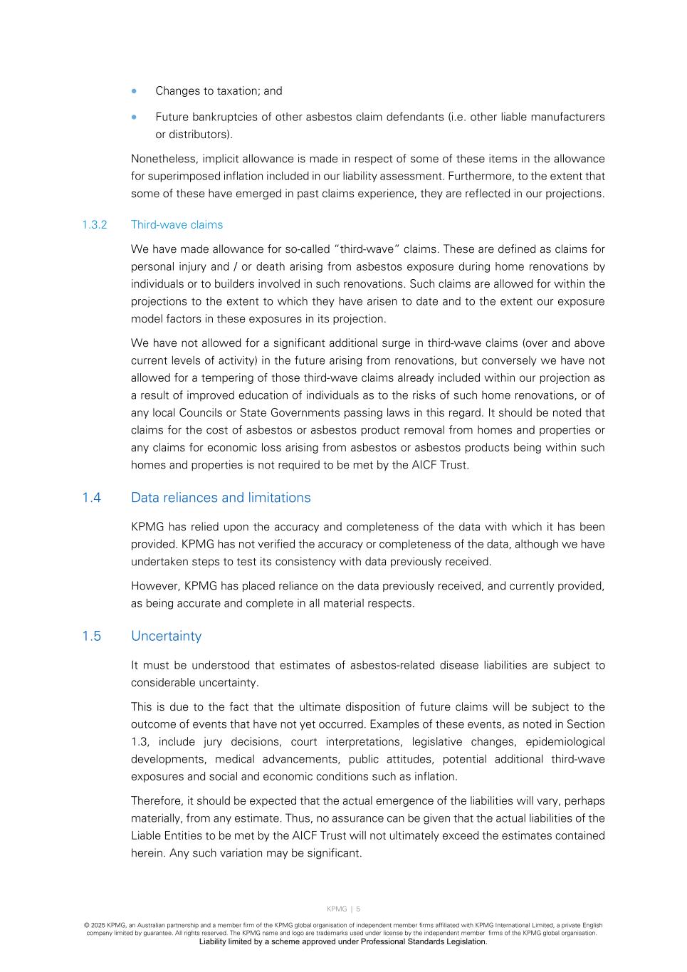 KPMG | 5 © 2025 KPMG, an Australian partnership and a member firm of the KPMG global organisation of independent member firms affiliated with KPMG International Limited, a private English company limited by guarantee. All rights reserved. The KPMG name and logo are trademarks used under license by the independent member firms of the KPMG global organisation. Liability limited by a scheme approved under Professional Standards Legislation. • Changes to taxation; and • Future bankruptcies of other asbestos claim defendants (i.e. other liable manufacturers or distributors). Nonetheless, implicit allowance is made in respect of some of these items in the allowance for superimposed inflation included in our liability assessment. Furthermore, to the extent that some of these have emerged in past claims experience, they are reflected in our projections. 1.3.2 Third-wave claims We have made allowance for so-called “third-wave” claims. These are defined as claims for personal injury and / or death arising from asbestos exposure during home renovations by individuals or to builders involved in such renovations. Such claims are allowed for within the projections to the extent to which they have arisen to date and to the extent our exposure model factors in these exposures in its projection. We have not allowed for a significant additional surge in third-wave claims (over and above current levels of activity) in the future arising from renovations, but conversely we have not allowed for a tempering of those third-wave claims already included within our projection as a result of improved education of individuals as to the risks of such home renovations, or of any local Councils or State Governments passing laws in this regard. It should be noted that claims for the cost of asbestos or asbestos product removal from homes and properties or any claims for economic loss arising from asbestos or asbestos products being within such homes and properties is not required to be met by the AICF Trust. 1.4 Data reliances and limitations KPMG has relied upon the accuracy and completeness of the data with which it has been provided. KPMG has not verified the accuracy or completeness of the data, although we have undertaken steps to test its consistency with data previously received. However, KPMG has placed reliance on the data previously received, and currently provided, as being accurate and complete in all material respects. 1.5 Uncertainty It must be understood that estimates of asbestos-related disease liabilities are subject to considerable uncertainty. This is due to the fact that the ultimate disposition of future claims will be subject to the outcome of events that have not yet occurred. Examples of these events, as noted in Section 1.3, include jury decisions, court interpretations, legislative changes, epidemiological developments, medical advancements, public attitudes, potential additional third-wave exposures and social and economic conditions such as inflation. Therefore, it should be expected that the actual emergence of the liabilities will vary, perhaps materially, from any estimate. Thus, no assurance can be given that the actual liabilities of the Liable Entities to be met by the AICF Trust will not ultimately exceed the estimates contained herein. Any such variation may be significant.
