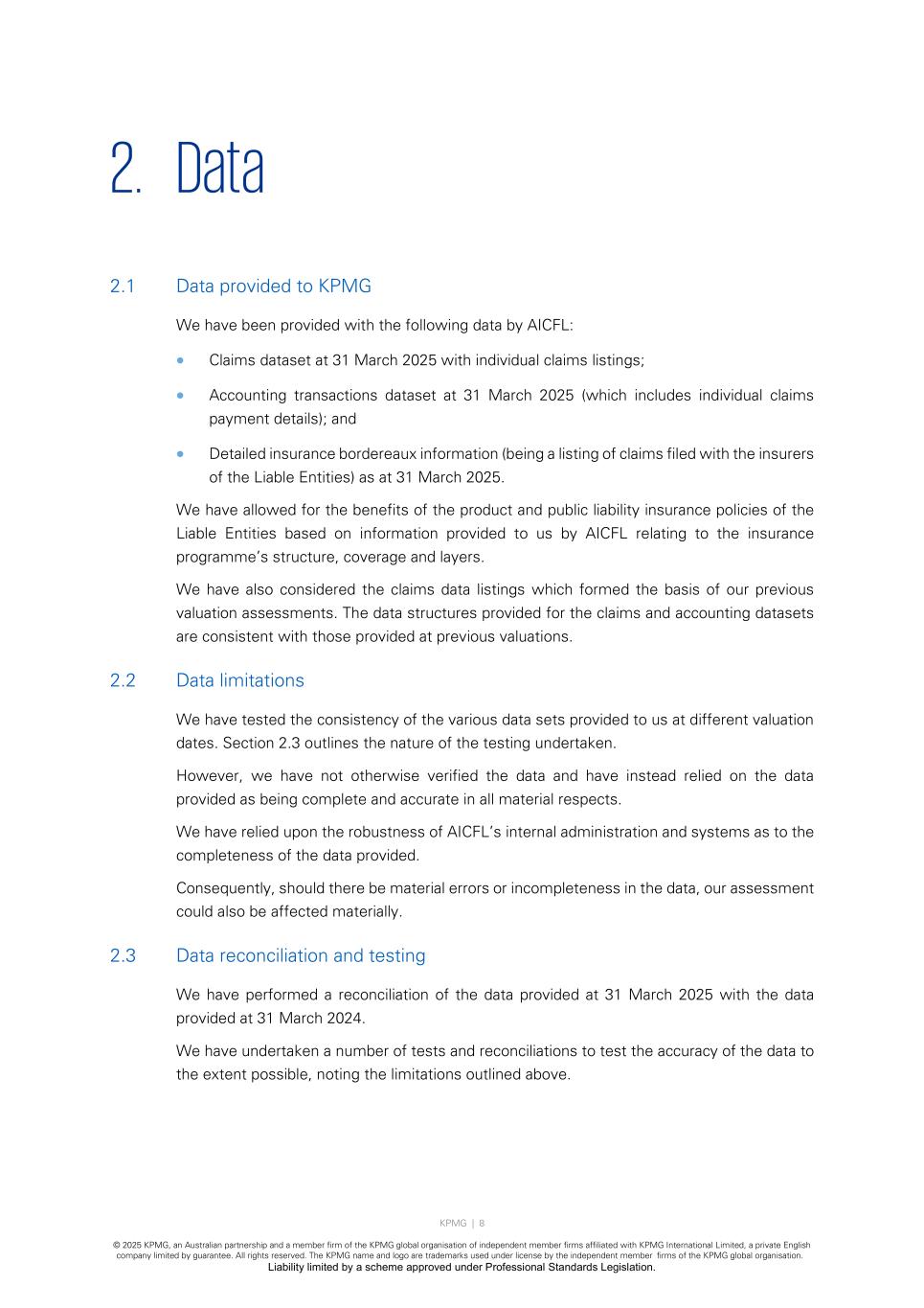 KPMG | 8 © 2025 KPMG, an Australian partnership and a member firm of the KPMG global organisation of independent member firms affiliated with KPMG International Limited, a private English company limited by guarantee. All rights reserved. The KPMG name and logo are trademarks used under license by the independent member firms of the KPMG global organisation. Liability limited by a scheme approved under Professional Standards Legislation. 2. Data 2.1 Data provided to KPMG We have been provided with the following data by AICFL: • Claims dataset at 31 March 2025 with individual claims listings; • Accounting transactions dataset at 31 March 2025 (which includes individual claims payment details); and • Detailed insurance bordereaux information (being a listing of claims filed with the insurers of the Liable Entities) as at 31 March 2025. We have allowed for the benefits of the product and public liability insurance policies of the Liable Entities based on information provided to us by AICFL relating to the insurance programme’s structure, coverage and layers. We have also considered the claims data listings which formed the basis of our previous valuation assessments. The data structures provided for the claims and accounting datasets are consistent with those provided at previous valuations. 2.2 Data limitations We have tested the consistency of the various data sets provided to us at different valuation dates. Section 2.3 outlines the nature of the testing undertaken. However, we have not otherwise verified the data and have instead relied on the data provided as being complete and accurate in all material respects. We have relied upon the robustness of AICFL’s internal administration and systems as to the completeness of the data provided. Consequently, should there be material errors or incompleteness in the data, our assessment could also be affected materially. 2.3 Data reconciliation and testing We have performed a reconciliation of the data provided at 31 March 2025 with the data provided at 31 March 2024. We have undertaken a number of tests and reconciliations to test the accuracy of the data to the extent possible, noting the limitations outlined above.