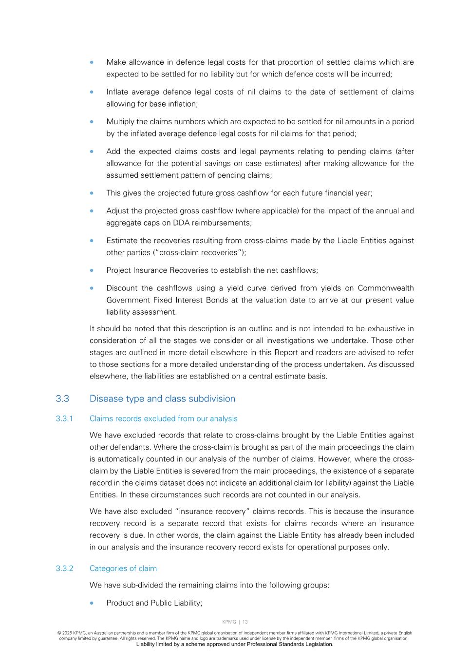 KPMG | 13 © 2025 KPMG, an Australian partnership and a member firm of the KPMG global organisation of independent member firms affiliated with KPMG International Limited, a private English company limited by guarantee. All rights reserved. The KPMG name and logo are trademarks used under license by the independent member firms of the KPMG global organisation. Liability limited by a scheme approved under Professional Standards Legislation. • Make allowance in defence legal costs for that proportion of settled claims which are expected to be settled for no liability but for which defence costs will be incurred; • Inflate average defence legal costs of nil claims to the date of settlement of claims allowing for base inflation; • Multiply the claims numbers which are expected to be settled for nil amounts in a period by the inflated average defence legal costs for nil claims for that period; • Add the expected claims costs and legal payments relating to pending claims (after allowance for the potential savings on case estimates) after making allowance for the assumed settlement pattern of pending claims; • This gives the projected future gross cashflow for each future financial year; • Adjust the projected gross cashflow (where applicable) for the impact of the annual and aggregate caps on DDA reimbursements; • Estimate the recoveries resulting from cross-claims made by the Liable Entities against other parties (“cross-claim recoveries”); • Project Insurance Recoveries to establish the net cashflows; • Discount the cashflows using a yield curve derived from yields on Commonwealth Government Fixed Interest Bonds at the valuation date to arrive at our present value liability assessment. It should be noted that this description is an outline and is not intended to be exhaustive in consideration of all the stages we consider or all investigations we undertake. Those other stages are outlined in more detail elsewhere in this Report and readers are advised to refer to those sections for a more detailed understanding of the process undertaken. As discussed elsewhere, the liabilities are established on a central estimate basis. 3.3 Disease type and class subdivision 3.3.1 Claims records excluded from our analysis We have excluded records that relate to cross-claims brought by the Liable Entities against other defendants. Where the cross-claim is brought as part of the main proceedings the claim is automatically counted in our analysis of the number of claims. However, where the cross- claim by the Liable Entities is severed from the main proceedings, the existence of a separate record in the claims dataset does not indicate an additional claim (or liability) against the Liable Entities. In these circumstances such records are not counted in our analysis. We have also excluded “insurance recovery” claims records. This is because the insurance recovery record is a separate record that exists for claims records where an insurance recovery is due. In other words, the claim against the Liable Entity has already been included in our analysis and the insurance recovery record exists for operational purposes only. 3.3.2 Categories of claim We have sub-divided the remaining claims into the following groups: • Product and Public Liability;