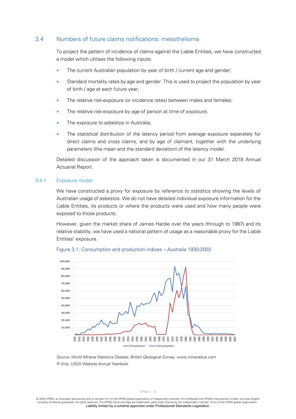 KPMG | 15 © 2025 KPMG, an Australian partnership and a member firm of the KPMG global organisation of independent member firms affiliated with KPMG International Limited, a private English company limited by guarantee. All rights reserved. The KPMG name and logo are trademarks used under license by the independent member firms of the KPMG global organisation. Liability limited by a scheme approved under Professional Standards Legislation. 3.4 Numbers of future claims notifications: mesothelioma To project the pattern of incidence of claims against the Liable Entities, we have constructed a model which utilises the following inputs: • The current Australian population by year of birth / current age and gender; • Standard mortality rates by age and gender. This is used to project the population by year of birth / age at each future year; • The relative risk-exposure (or incidence rates) between males and females; • The relative risk-exposure by age of person at time of exposure; • The exposure to asbestos in Australia; • The statistical distribution of the latency period from average exposure separately for direct claims and cross claims, and by age of claimant, together with the underlying parameters (the mean and the standard deviation) of the latency model. Detailed discussion of the approach taken is documented in our 31 March 2018 Annual Actuarial Report. 3.4.1 Exposure model We have constructed a proxy for exposure by reference to statistics showing the levels of Australian usage of asbestos. We do not have detailed individual exposure information for the Liable Entities, its products or where the products were used and how many people were exposed to those products. However, given the market share of James Hardie over the years (through to 1987) and its relative stability, we have used a national pattern of usage as a reasonable proxy for the Liable Entities’ exposure. Figure 3.1: Consumption and production indices – Australia 1930-2002 Source: World Mineral Statistics Dataset, British Geological Survey, www.mineralsuk.com R Virta, USGS Website Annual Yearbook - 10,000 20,000 30,000 40,000 50,000 60,000 70,000 80,000 90,000 100,000 19 30 19 32 19 34 19 36 19 38 19 40 19 42 19 44 19 46 19 48 19 50 19 52 19 54 19 56 19 58 19 60 19 62 19 64 19 66 19 68 19 70 19 72 19 74 19 76 19 78 19 80 19 82 19 84 19 86 19 88 19 90 19 92 19 94 19 96 19 98 20 00 20 02 Production Consumption