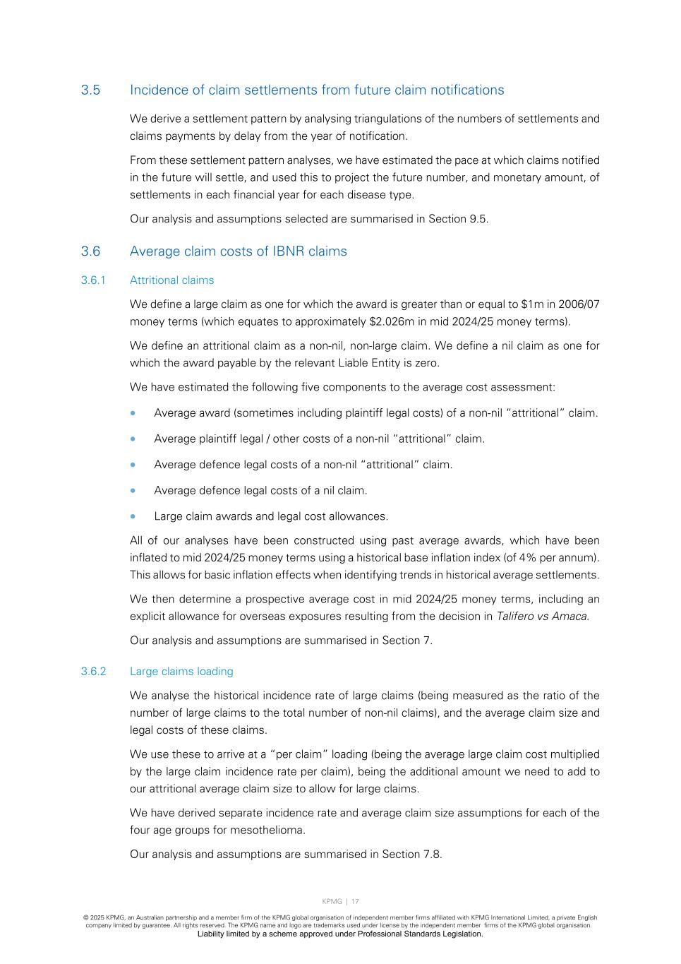 KPMG | 17 © 2025 KPMG, an Australian partnership and a member firm of the KPMG global organisation of independent member firms affiliated with KPMG International Limited, a private English company limited by guarantee. All rights reserved. The KPMG name and logo are trademarks used under license by the independent member firms of the KPMG global organisation. Liability limited by a scheme approved under Professional Standards Legislation. 3.5 Incidence of claim settlements from future claim notifications We derive a settlement pattern by analysing triangulations of the numbers of settlements and claims payments by delay from the year of notification. From these settlement pattern analyses, we have estimated the pace at which claims notified in the future will settle, and used this to project the future number, and monetary amount, of settlements in each financial year for each disease type. Our analysis and assumptions selected are summarised in Section 9.5. 3.6 Average claim costs of IBNR claims 3.6.1 Attritional claims We define a large claim as one for which the award is greater than or equal to $1m in 2006/07 money terms (which equates to approximately $2.026m in mid 2024/25 money terms). We define an attritional claim as a non-nil, non-large claim. We define a nil claim as one for which the award payable by the relevant Liable Entity is zero. We have estimated the following five components to the average cost assessment: • Average award (sometimes including plaintiff legal costs) of a non-nil “attritional” claim. • Average plaintiff legal / other costs of a non-nil “attritional” claim. • Average defence legal costs of a non-nil “attritional” claim. • Average defence legal costs of a nil claim. • Large claim awards and legal cost allowances. All of our analyses have been constructed using past average awards, which have been inflated to mid 2024/25 money terms using a historical base inflation index (of 4% per annum). This allows for basic inflation effects when identifying trends in historical average settlements. We then determine a prospective average cost in mid 2024/25 money terms, including an explicit allowance for overseas exposures resulting from the decision in Talifero vs Amaca. Our analysis and assumptions are summarised in Section 7. 3.6.2 Large claims loading We analyse the historical incidence rate of large claims (being measured as the ratio of the number of large claims to the total number of non-nil claims), and the average claim size and legal costs of these claims. We use these to arrive at a “per claim” loading (being the average large claim cost multiplied by the large claim incidence rate per claim), being the additional amount we need to add to our attritional average claim size to allow for large claims. We have derived separate incidence rate and average claim size assumptions for each of the four age groups for mesothelioma. Our analysis and assumptions are summarised in Section 7.8.