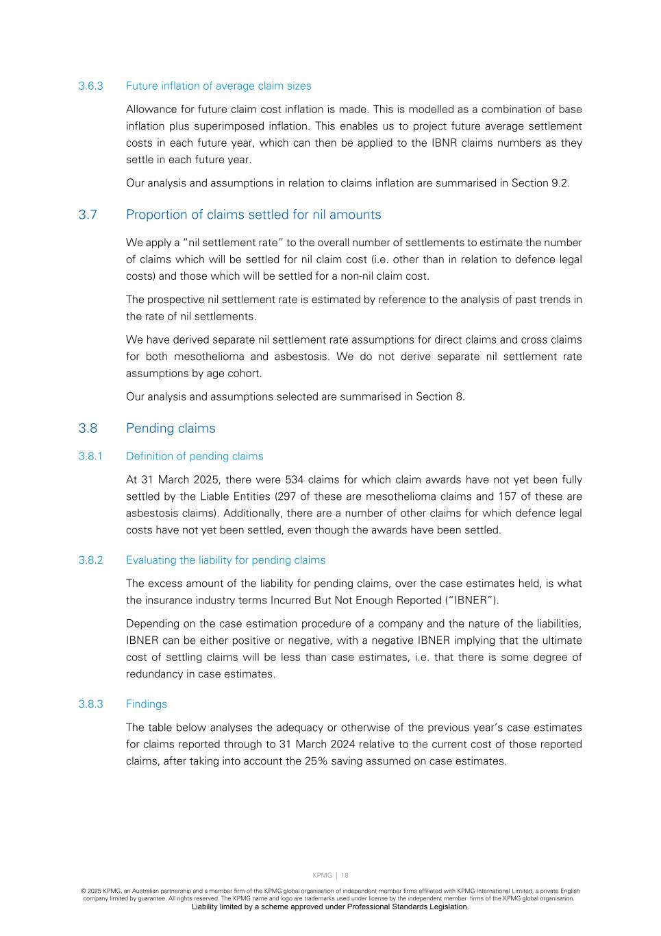 KPMG | 18 © 2025 KPMG, an Australian partnership and a member firm of the KPMG global organisation of independent member firms affiliated with KPMG International Limited, a private English company limited by guarantee. All rights reserved. The KPMG name and logo are trademarks used under license by the independent member firms of the KPMG global organisation. Liability limited by a scheme approved under Professional Standards Legislation. 3.6.3 Future inflation of average claim sizes Allowance for future claim cost inflation is made. This is modelled as a combination of base inflation plus superimposed inflation. This enables us to project future average settlement costs in each future year, which can then be applied to the IBNR claims numbers as they settle in each future year. Our analysis and assumptions in relation to claims inflation are summarised in Section 9.2. 3.7 Proportion of claims settled for nil amounts We apply a “nil settlement rate” to the overall number of settlements to estimate the number of claims which will be settled for nil claim cost (i.e. other than in relation to defence legal costs) and those which will be settled for a non-nil claim cost. The prospective nil settlement rate is estimated by reference to the analysis of past trends in the rate of nil settlements. We have derived separate nil settlement rate assumptions for direct claims and cross claims for both mesothelioma and asbestosis. We do not derive separate nil settlement rate assumptions by age cohort. Our analysis and assumptions selected are summarised in Section 8. 3.8 Pending claims 3.8.1 Definition of pending claims At 31 March 2025, there were 534 claims for which claim awards have not yet been fully settled by the Liable Entities (297 of these are mesothelioma claims and 157 of these are asbestosis claims). Additionally, there are a number of other claims for which defence legal costs have not yet been settled, even though the awards have been settled. 3.8.2 Evaluating the liability for pending claims The excess amount of the liability for pending claims, over the case estimates held, is what the insurance industry terms Incurred But Not Enough Reported (“IBNER”). Depending on the case estimation procedure of a company and the nature of the liabilities, IBNER can be either positive or negative, with a negative IBNER implying that the ultimate cost of settling claims will be less than case estimates, i.e. that there is some degree of redundancy in case estimates. 3.8.3 Findings The table below analyses the adequacy or otherwise of the previous year’s case estimates for claims reported through to 31 March 2024 relative to the current cost of those reported claims, after taking into account the 25% saving assumed on case estimates.
