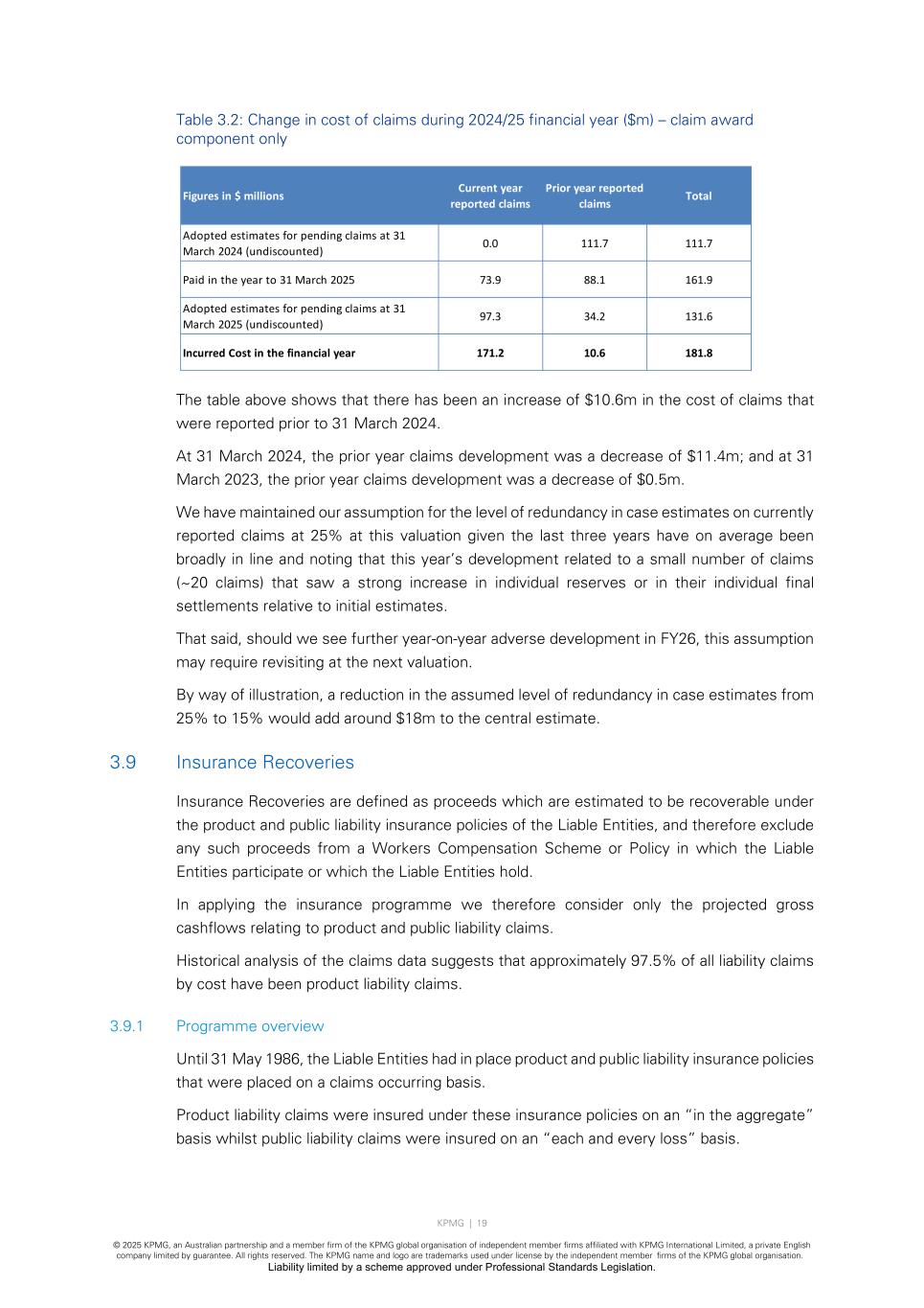 KPMG | 19 © 2025 KPMG, an Australian partnership and a member firm of the KPMG global organisation of independent member firms affiliated with KPMG International Limited, a private English company limited by guarantee. All rights reserved. The KPMG name and logo are trademarks used under license by the independent member firms of the KPMG global organisation. Liability limited by a scheme approved under Professional Standards Legislation. Table 3.2: Change in cost of claims during 2024/25 financial year ($m) – claim award component only The table above shows that there has been an increase of $10.6m in the cost of claims that were reported prior to 31 March 2024. At 31 March 2024, the prior year claims development was a decrease of $11.4m; and at 31 March 2023, the prior year claims development was a decrease of $0.5m. We have maintained our assumption for the level of redundancy in case estimates on currently reported claims at 25% at this valuation given the last three years have on average been broadly in line and noting that this year’s development related to a small number of claims (~20 claims) that saw a strong increase in individual reserves or in their individual final settlements relative to initial estimates. That said, should we see further year-on-year adverse development in FY26, this assumption may require revisiting at the next valuation. By way of illustration, a reduction in the assumed level of redundancy in case estimates from 25% to 15% would add around $18m to the central estimate. 3.9 Insurance Recoveries Insurance Recoveries are defined as proceeds which are estimated to be recoverable under the product and public liability insurance policies of the Liable Entities, and therefore exclude any such proceeds from a Workers Compensation Scheme or Policy in which the Liable Entities participate or which the Liable Entities hold. In applying the insurance programme we therefore consider only the projected gross cashflows relating to product and public liability claims. Historical analysis of the claims data suggests that approximately 97.5% of all liability claims by cost have been product liability claims. 3.9.1 Programme overview Until 31 May 1986, the Liable Entities had in place product and public liability insurance policies that were placed on a claims occurring basis. Product liability claims were insured under these insurance policies on an “in the aggregate” basis whilst public liability claims were insured on an “each and every loss” basis. Figures in $ millions Current year reported claims Prior year reported claims Total Adopted estimates for pending claims at 31 March 2024 (undiscounted) 0.0 111.7 111.7 Paid in the year to 31 March 2025 73.9 88.1 161.9 Adopted estimates for pending claims at 31 March 2025 (undiscounted) 97.3 34.2 131.6 Incurred Cost in the financial year 171.2 10.6 181.8