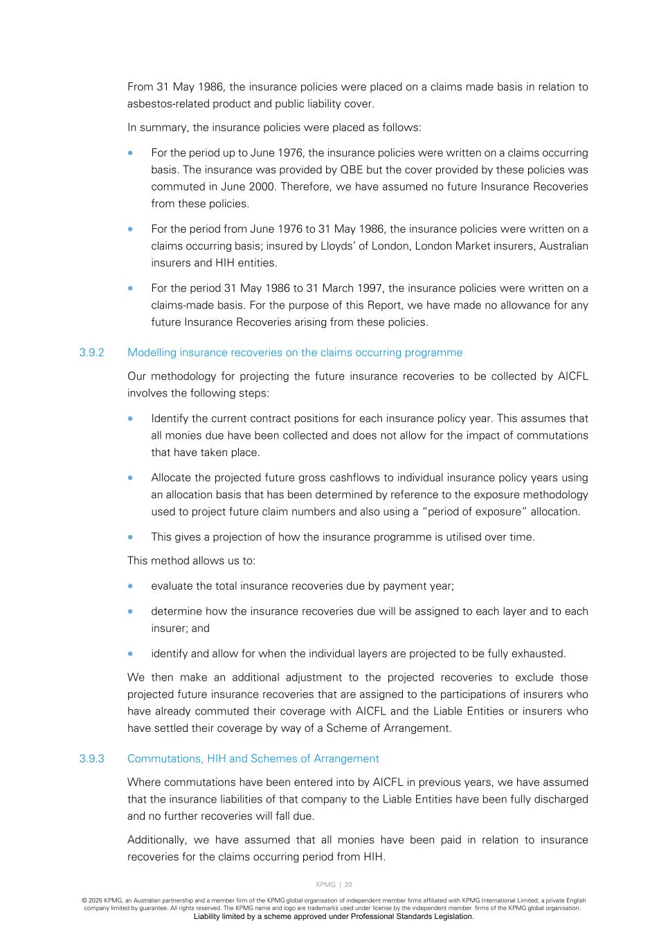 KPMG | 20 © 2025 KPMG, an Australian partnership and a member firm of the KPMG global organisation of independent member firms affiliated with KPMG International Limited, a private English company limited by guarantee. All rights reserved. The KPMG name and logo are trademarks used under license by the independent member firms of the KPMG global organisation. Liability limited by a scheme approved under Professional Standards Legislation. From 31 May 1986, the insurance policies were placed on a claims made basis in relation to asbestos-related product and public liability cover. In summary, the insurance policies were placed as follows: • For the period up to June 1976, the insurance policies were written on a claims occurring basis. The insurance was provided by QBE but the cover provided by these policies was commuted in June 2000. Therefore, we have assumed no future Insurance Recoveries from these policies. • For the period from June 1976 to 31 May 1986, the insurance policies were written on a claims occurring basis; insured by Lloyds’ of London, London Market insurers, Australian insurers and HIH entities. • For the period 31 May 1986 to 31 March 1997, the insurance policies were written on a claims-made basis. For the purpose of this Report, we have made no allowance for any future Insurance Recoveries arising from these policies. 3.9.2 Modelling insurance recoveries on the claims occurring programme Our methodology for projecting the future insurance recoveries to be collected by AICFL involves the following steps: • Identify the current contract positions for each insurance policy year. This assumes that all monies due have been collected and does not allow for the impact of commutations that have taken place. • Allocate the projected future gross cashflows to individual insurance policy years using an allocation basis that has been determined by reference to the exposure methodology used to project future claim numbers and also using a “period of exposure” allocation. • This gives a projection of how the insurance programme is utilised over time. This method allows us to: • evaluate the total insurance recoveries due by payment year; • determine how the insurance recoveries due will be assigned to each layer and to each insurer; and • identify and allow for when the individual layers are projected to be fully exhausted. We then make an additional adjustment to the projected recoveries to exclude those projected future insurance recoveries that are assigned to the participations of insurers who have already commuted their coverage with AICFL and the Liable Entities or insurers who have settled their coverage by way of a Scheme of Arrangement. 3.9.3 Commutations, HIH and Schemes of Arrangement Where commutations have been entered into by AICFL in previous years, we have assumed that the insurance liabilities of that company to the Liable Entities have been fully discharged and no further recoveries will fall due. Additionally, we have assumed that all monies have been paid in relation to insurance recoveries for the claims occurring period from HIH.