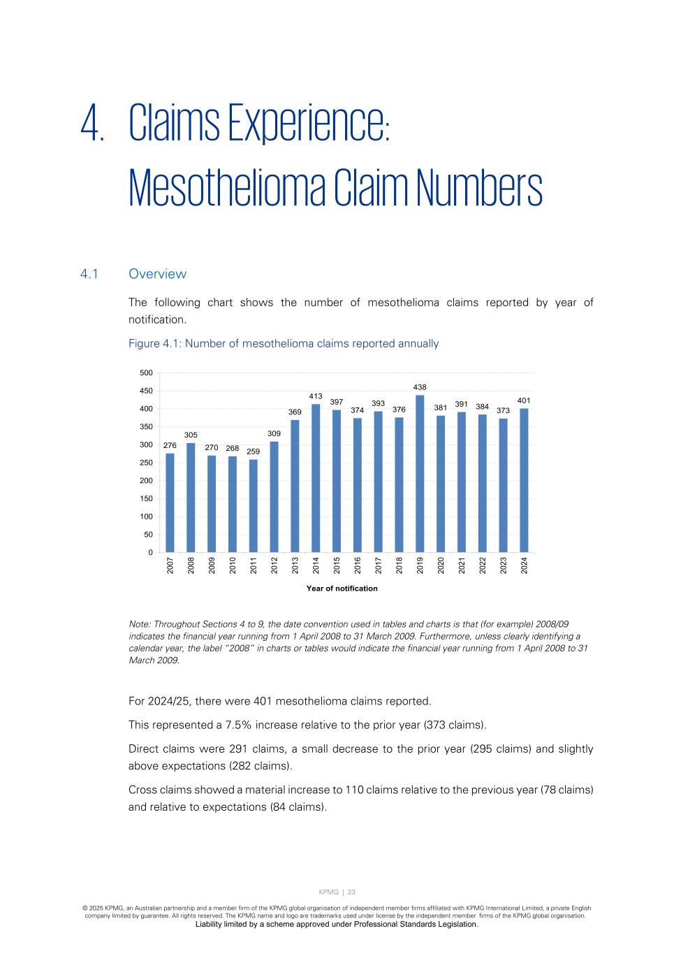 KPMG | 23 © 2025 KPMG, an Australian partnership and a member firm of the KPMG global organisation of independent member firms affiliated with KPMG International Limited, a private English company limited by guarantee. All rights reserved. The KPMG name and logo are trademarks used under license by the independent member firms of the KPMG global organisation. Liability limited by a scheme approved under Professional Standards Legislation. 4. Claims Experience: Mesothelioma Claim Numbers 4.1 Overview The following chart shows the number of mesothelioma claims reported by year of notification. Figure 4.1: Number of mesothelioma claims reported annually Note: Throughout Sections 4 to 9, the date convention used in tables and charts is that (for example) 2008/09 indicates the financial year running from 1 April 2008 to 31 March 2009. Furthermore, unless clearly identifying a calendar year, the label “2008” in charts or tables would indicate the financial year running from 1 April 2008 to 31 March 2009. For 2024/25, there were 401 mesothelioma claims reported. This represented a 7.5% increase relative to the prior year (373 claims). Direct claims were 291 claims, a small decrease to the prior year (295 claims) and slightly above expectations (282 claims). Cross claims showed a material increase to 110 claims relative to the previous year (78 claims) and relative to expectations (84 claims). 276 305 270 268 259 309 369 413 397 374 393 376 438 381 391 384 373 401 0 50 100 150 200 250 300 350 400 450 500 20 07 20 08 20 09 20 10 20 11 20 12 20 13 20 14 20 15 20 16 20 17 20 18 20 19 20 20 20 21 20 22 20 23 20 24 Year of notification
