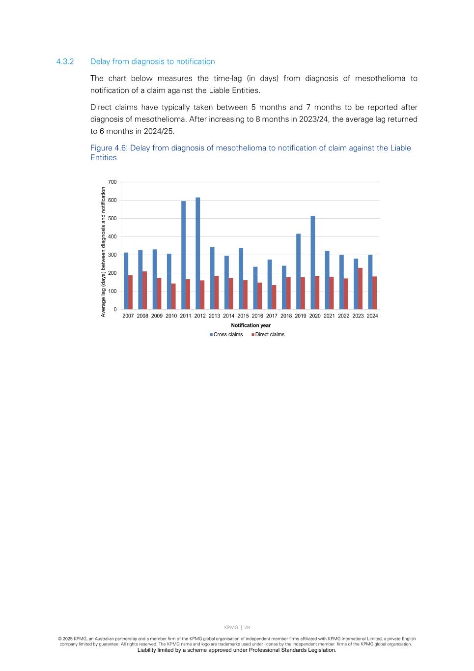 KPMG | 28 © 2025 KPMG, an Australian partnership and a member firm of the KPMG global organisation of independent member firms affiliated with KPMG International Limited, a private English company limited by guarantee. All rights reserved. The KPMG name and logo are trademarks used under license by the independent member firms of the KPMG global organisation. Liability limited by a scheme approved under Professional Standards Legislation. 4.3.2 Delay from diagnosis to notification The chart below measures the time-lag (in days) from diagnosis of mesothelioma to notification of a claim against the Liable Entities. Direct claims have typically taken between 5 months and 7 months to be reported after diagnosis of mesothelioma. After increasing to 8 months in 2023/24, the average lag returned to 6 months in 2024/25. Figure 4.6: Delay from diagnosis of mesothelioma to notification of claim against the Liable Entities 0 100 200 300 400 500 600 700 2007 2008 2009 2010 2011 2012 2013 2014 2015 2016 2017 2018 2019 2020 2021 2022 2023 2024A ve ra ge la g (d ay s) b et w ee n di ag no si s an d no tif ic at io n Notification year Cross claims Direct claims