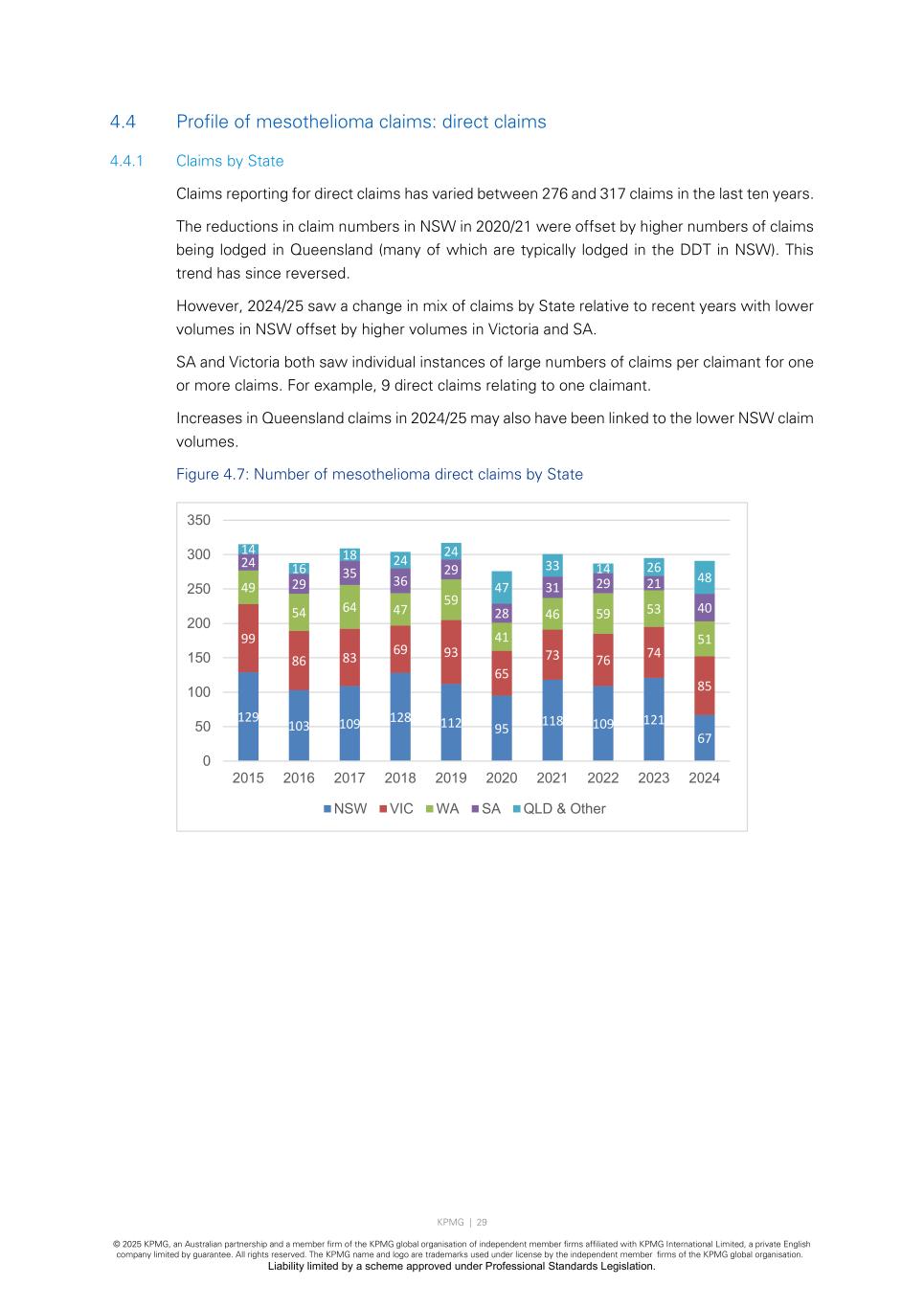 KPMG | 29 © 2025 KPMG, an Australian partnership and a member firm of the KPMG global organisation of independent member firms affiliated with KPMG International Limited, a private English company limited by guarantee. All rights reserved. The KPMG name and logo are trademarks used under license by the independent member firms of the KPMG global organisation. Liability limited by a scheme approved under Professional Standards Legislation. 4.4 Profile of mesothelioma claims: direct claims 4.4.1 Claims by State Claims reporting for direct claims has varied between 276 and 317 claims in the last ten years. The reductions in claim numbers in NSW in 2020/21 were offset by higher numbers of claims being lodged in Queensland (many of which are typically lodged in the DDT in NSW). This trend has since reversed. However, 2024/25 saw a change in mix of claims by State relative to recent years with lower volumes in NSW offset by higher volumes in Victoria and SA. SA and Victoria both saw individual instances of large numbers of claims per claimant for one or more claims. For example, 9 direct claims relating to one claimant. Increases in Queensland claims in 2024/25 may also have been linked to the lower NSW claim volumes. Figure 4.7: Number of mesothelioma direct claims by State 129 103 109 128 112 95 118 109 121 67 99 86 83 69 93 65 73 76 74 85 49 54 64 47 59 41 46 59 53 51 24 29 35 36 29 28 31 29 21 40 14 16 18 24 24 47 33 14 26 48 0 50 100 150 200 250 300 350 2015 2016 2017 2018 2019 2020 2021 2022 2023 2024 NSW VIC WA SA QLD & Other