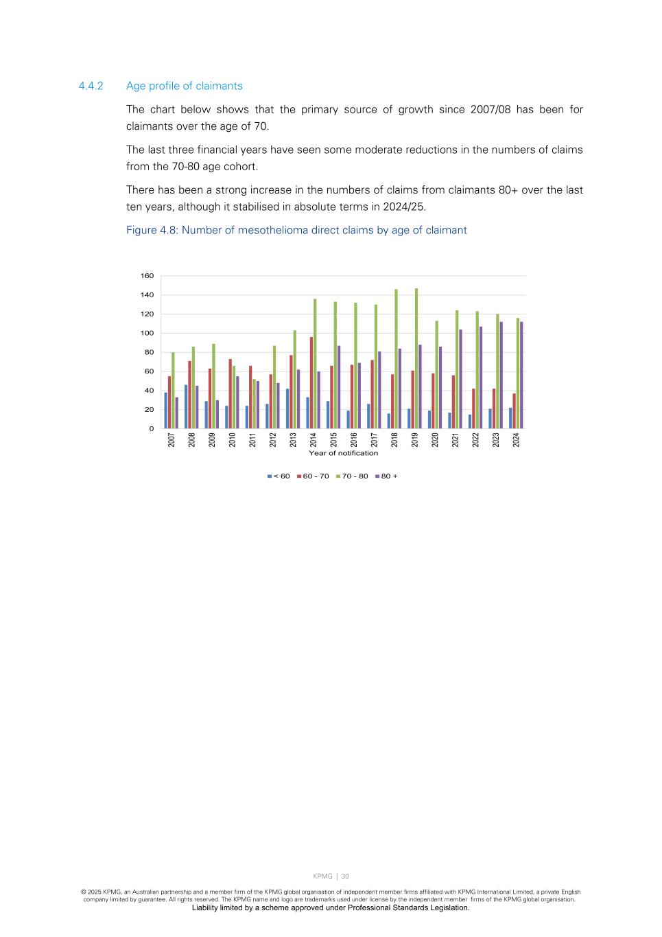 KPMG | 30 © 2025 KPMG, an Australian partnership and a member firm of the KPMG global organisation of independent member firms affiliated with KPMG International Limited, a private English company limited by guarantee. All rights reserved. The KPMG name and logo are trademarks used under license by the independent member firms of the KPMG global organisation. Liability limited by a scheme approved under Professional Standards Legislation. 4.4.2 Age profile of claimants The chart below shows that the primary source of growth since 2007/08 has been for claimants over the age of 70. The last three financial years have seen some moderate reductions in the numbers of claims from the 70-80 age cohort. There has been a strong increase in the numbers of claims from claimants 80+ over the last ten years, although it stabilised in absolute terms in 2024/25. Figure 4.8: Number of mesothelioma direct claims by age of claimant 0 20 40 60 80 100 120 140 160 20 07 20 08 20 09 20 10 20 11 20 12 20 13 20 14 20 15 20 16 20 17 20 18 20 19 20 20 20 21 20 22 20 23 20 24 Year of notification < 60 60 - 70 70 - 80 80 +