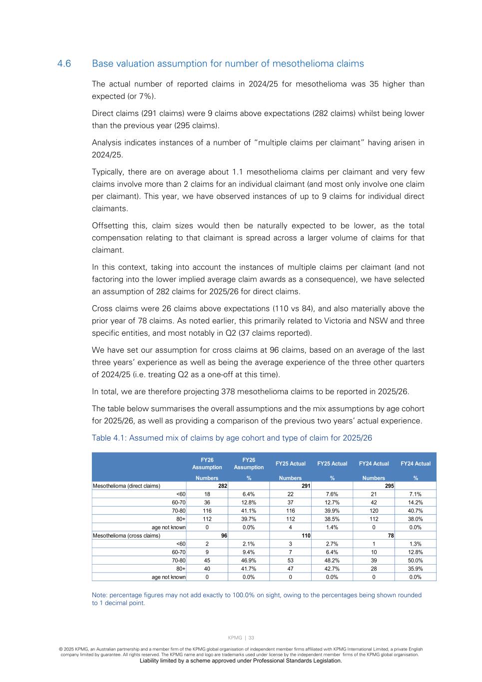 KPMG | 33 © 2025 KPMG, an Australian partnership and a member firm of the KPMG global organisation of independent member firms affiliated with KPMG International Limited, a private English company limited by guarantee. All rights reserved. The KPMG name and logo are trademarks used under license by the independent member firms of the KPMG global organisation. Liability limited by a scheme approved under Professional Standards Legislation. 4.6 Base valuation assumption for number of mesothelioma claims The actual number of reported claims in 2024/25 for mesothelioma was 35 higher than expected (or 7%). Direct claims (291 claims) were 9 claims above expectations (282 claims) whilst being lower than the previous year (295 claims). Analysis indicates instances of a number of “multiple claims per claimant” having arisen in 2024/25. Typically, there are on average about 1.1 mesothelioma claims per claimant and very few claims involve more than 2 claims for an individual claimant (and most only involve one claim per claimant). This year, we have observed instances of up to 9 claims for individual direct claimants. Offsetting this, claim sizes would then be naturally expected to be lower, as the total compensation relating to that claimant is spread across a larger volume of claims for that claimant. In this context, taking into account the instances of multiple claims per claimant (and not factoring into the lower implied average claim awards as a consequence), we have selected an assumption of 282 claims for 2025/26 for direct claims. Cross claims were 26 claims above expectations (110 vs 84), and also materially above the prior year of 78 claims. As noted earlier, this primarily related to Victoria and NSW and three specific entities, and most notably in Q2 (37 claims reported). We have set our assumption for cross claims at 96 claims, based on an average of the last three years’ experience as well as being the average experience of the three other quarters of 2024/25 (i.e. treating Q2 as a one-off at this time). In total, we are therefore projecting 378 mesothelioma claims to be reported in 2025/26. The table below summarises the overall assumptions and the mix assumptions by age cohort for 2025/26, as well as providing a comparison of the previous two years’ actual experience. Table 4.1: Assumed mix of claims by age cohort and type of claim for 2025/26 Note: percentage figures may not add exactly to 100.0% on sight, owing to the percentages being shown rounded to 1 decimal point. FY26 Assumption FY26 Assumption FY25 Actual FY25 Actual FY24 Actual FY24 Actual Numbers % Numbers % Numbers % Mesothelioma (direct claims) 282 291 295 <60 18 6.4% 22 7.6% 21 7.1% 60-70 36 12.8% 37 12.7% 42 14.2% 70-80 116 41.1% 116 39.9% 120 40.7% 80+ 112 39.7% 112 38.5% 112 38.0% age not known 0 0.0% 4 1.4% 0 0.0% Mesothelioma (cross claims) 96 110 78 <60 2 2.1% 3 2.7% 1 1.3% 60-70 9 9.4% 7 6.4% 10 12.8% 70-80 45 46.9% 53 48.2% 39 50.0% 80+ 40 41.7% 47 42.7% 28 35.9% age not known 0 0.0% 0 0.0% 0 0.0%