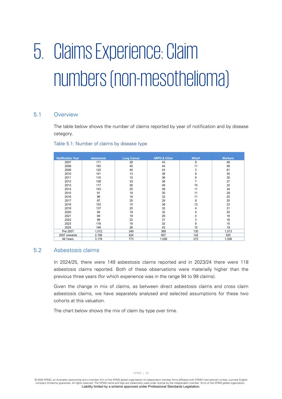 KPMG | 35 © 2025 KPMG, an Australian partnership and a member firm of the KPMG global organisation of independent member firms affiliated with KPMG International Limited, a private English company limited by guarantee. All rights reserved. The KPMG name and logo are trademarks used under license by the independent member firms of the KPMG global organisation. Liability limited by a scheme approved under Professional Standards Legislation. 5. Claims Experience: Claim numbers (non-mesothelioma) 5.1 Overview The table below shows the number of claims reported by year of notification and by disease category. Table 5.1: Number of claims by disease type 5.2 Asbestosis claims In 2024/25, there were 149 asbestosis claims reported and in 2023/24 there were 118 asbestosis claims reported. Both of these observations were materially higher than the previous three years (for which experience was in the range 94 to 99 claims). Given the change in mix of claims, as between direct asbestosis claims and cross claim asbestosis claims, we have separately analysed and selected assumptions for these two cohorts at this valuation. The chart below shows the mix of claim by type over time. Notification Year Asbestosis Lung Cancer ARPD & Other Wharf Workers 2007 171 28 43 8 46 2008 163 40 44 11 59 2009 120 40 43 3 61 2010 141 13 36 8 30 2011 110 15 36 6 30 2012 128 33 38 7 27 2013 117 26 49 15 32 2014 143 25 39 11 34 2015 91 19 30 11 29 2016 96 18 33 11 25 2017 87 25 29 8 20 2018 103 15 38 13 23 2019 137 25 32 4 21 2020 94 18 32 0 20 2021 99 18 29 0 18 2022 99 22 31 3 16 2023 118 18 32 8 15 2024 149 26 43 15 19 Pre 2007 1,012 349 369 130 1,013 2007 onwards 2,166 424 657 142 525 All Years 3,178 773 1,026 272 1,538