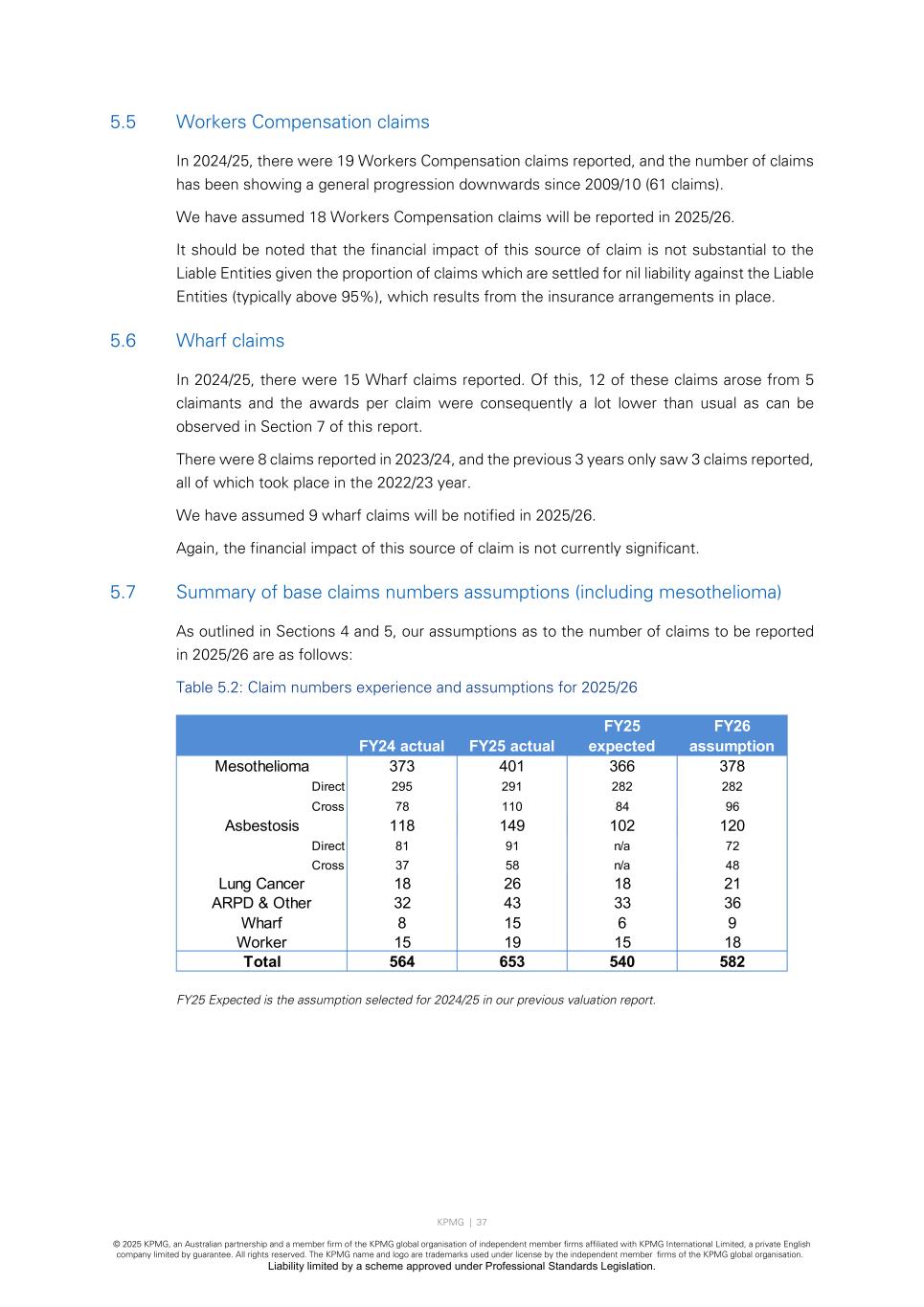 KPMG | 37 © 2025 KPMG, an Australian partnership and a member firm of the KPMG global organisation of independent member firms affiliated with KPMG International Limited, a private English company limited by guarantee. All rights reserved. The KPMG name and logo are trademarks used under license by the independent member firms of the KPMG global organisation. Liability limited by a scheme approved under Professional Standards Legislation. 5.5 Workers Compensation claims In 2024/25, there were 19 Workers Compensation claims reported, and the number of claims has been showing a general progression downwards since 2009/10 (61 claims). We have assumed 18 Workers Compensation claims will be reported in 2025/26. It should be noted that the financial impact of this source of claim is not substantial to the Liable Entities given the proportion of claims which are settled for nil liability against the Liable Entities (typically above 95%), which results from the insurance arrangements in place. 5.6 Wharf claims In 2024/25, there were 15 Wharf claims reported. Of this, 12 of these claims arose from 5 claimants and the awards per claim were consequently a lot lower than usual as can be observed in Section 7 of this report. There were 8 claims reported in 2023/24, and the previous 3 years only saw 3 claims reported, all of which took place in the 2022/23 year. We have assumed 9 wharf claims will be notified in 2025/26. Again, the financial impact of this source of claim is not currently significant. 5.7 Summary of base claims numbers assumptions (including mesothelioma) As outlined in Sections 4 and 5, our assumptions as to the number of claims to be reported in 2025/26 are as follows: Table 5.2: Claim numbers experience and assumptions for 2025/26 FY25 Expected is the assumption selected for 2024/25 in our previous valuation report. FY24 actual FY25 actual FY25 expected FY26 assumption Mesothelioma 373 401 366 378 Direct 295 291 282 282 Cross 78 110 84 96 Asbestosis 118 149 102 120 Direct 81 91 n/a 72 Cross 37 58 n/a 48 Lung Cancer 18 26 18 21 ARPD & Other 32 43 33 36 Wharf 8 15 6 9 Worker 15 19 15 18 Total 564 653 540 582