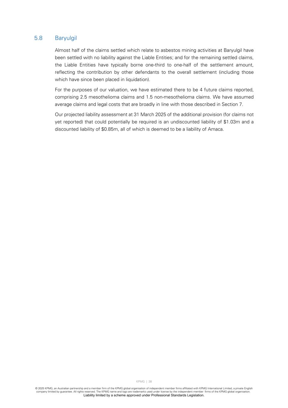 KPMG | 38 © 2025 KPMG, an Australian partnership and a member firm of the KPMG global organisation of independent member firms affiliated with KPMG International Limited, a private English company limited by guarantee. All rights reserved. The KPMG name and logo are trademarks used under license by the independent member firms of the KPMG global organisation. Liability limited by a scheme approved under Professional Standards Legislation. 5.8 Baryulgil Almost half of the claims settled which relate to asbestos mining activities at Baryulgil have been settled with no liability against the Liable Entities; and for the remaining settled claims, the Liable Entities have typically borne one-third to one-half of the settlement amount, reflecting the contribution by other defendants to the overall settlement (including those which have since been placed in liquidation). For the purposes of our valuation, we have estimated there to be 4 future claims reported, comprising 2.5 mesothelioma claims and 1.5 non-mesothelioma claims. We have assumed average claims and legal costs that are broadly in line with those described in Section 7. Our projected liability assessment at 31 March 2025 of the additional provision (for claims not yet reported) that could potentially be required is an undiscounted liability of $1.03m and a discounted liability of $0.85m, all of which is deemed to be a liability of Amaca.