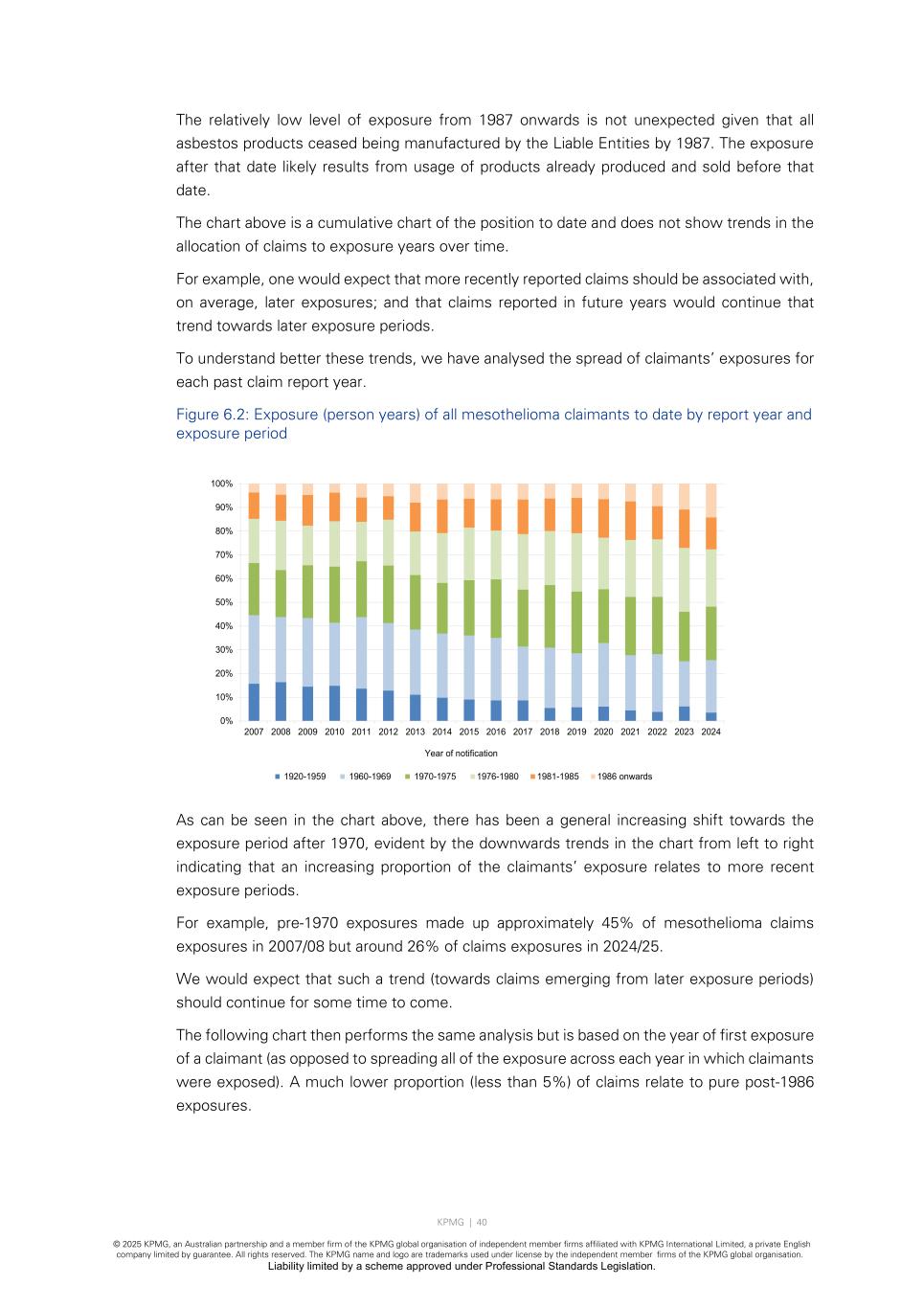 KPMG | 40 © 2025 KPMG, an Australian partnership and a member firm of the KPMG global organisation of independent member firms affiliated with KPMG International Limited, a private English company limited by guarantee. All rights reserved. The KPMG name and logo are trademarks used under license by the independent member firms of the KPMG global organisation. Liability limited by a scheme approved under Professional Standards Legislation. The relatively low level of exposure from 1987 onwards is not unexpected given that all asbestos products ceased being manufactured by the Liable Entities by 1987. The exposure after that date likely results from usage of products already produced and sold before that date. The chart above is a cumulative chart of the position to date and does not show trends in the allocation of claims to exposure years over time. For example, one would expect that more recently reported claims should be associated with, on average, later exposures; and that claims reported in future years would continue that trend towards later exposure periods. To understand better these trends, we have analysed the spread of claimants’ exposures for each past claim report year. Figure 6.2: Exposure (person years) of all mesothelioma claimants to date by report year and exposure period As can be seen in the chart above, there has been a general increasing shift towards the exposure period after 1970, evident by the downwards trends in the chart from left to right indicating that an increasing proportion of the claimants’ exposure relates to more recent exposure periods. For example, pre-1970 exposures made up approximately 45% of mesothelioma claims exposures in 2007/08 but around 26% of claims exposures in 2024/25. We would expect that such a trend (towards claims emerging from later exposure periods) should continue for some time to come. The following chart then performs the same analysis but is based on the year of first exposure of a claimant (as opposed to spreading all of the exposure across each year in which claimants were exposed). A much lower proportion (less than 5%) of claims relate to pure post-1986 exposures. 0% 10% 20% 30% 40% 50% 60% 70% 80% 90% 100% 2007 2008 2009 2010 2011 2012 2013 2014 2015 2016 2017 2018 2019 2020 2021 2022 2023 2024 Year of notification 1920-1959 1960-1969 1970-1975 1976-1980 1981-1985 1986 onwards