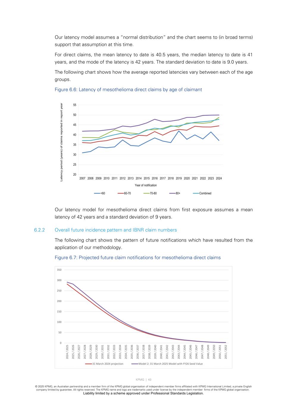 KPMG | 43 © 2025 KPMG, an Australian partnership and a member firm of the KPMG global organisation of independent member firms affiliated with KPMG International Limited, a private English company limited by guarantee. All rights reserved. The KPMG name and logo are trademarks used under license by the independent member firms of the KPMG global organisation. Liability limited by a scheme approved under Professional Standards Legislation. Our latency model assumes a “normal distribution” and the chart seems to (in broad terms) support that assumption at this time. For direct claims, the mean latency to date is 40.5 years, the median latency to date is 41 years, and the mode of the latency is 42 years. The standard deviation to date is 9.0 years. The following chart shows how the average reported latencies vary between each of the age groups. Figure 6.6: Latency of mesothelioma direct claims by age of claimant Our latency model for mesothelioma direct claims from first exposure assumes a mean latency of 42 years and a standard deviation of 9 years. 6.2.2 Overall future incidence pattern and IBNR claim numbers The following chart shows the pattern of future notifications which have resulted from the application of our methodology. Figure 6.7: Projected future claim notifications for mesothelioma direct claims 20 25 30 35 40 45 50 55 2007 2008 2009 2010 2011 2012 2013 2014 2015 2016 2017 2018 2019 2020 2021 2022 2023 2024 L a te n cy p e ri o d ( ye a rs ) o f c la im s re p o rt e d in r e p o rt y e a r Year of notification <60 60-70 70-80 80+ Combined 0 50 100 150 200 250 300 350 20 24 / 20 25 20 25 / 20 26 20 26 / 20 27 20 27 / 20 28 20 28 / 20 29 20 29 / 20 30 20 30 / 20 31 20 31 / 20 32 20 32 / 20 33 20 33 / 20 34 20 34 / 20 35 20 35 / 20 36 20 36 / 20 37 20 37 / 20 38 20 38 / 20 39 20 39 / 20 40 20 40 / 20 41 20 41 / 20 42 20 42 / 20 43 20 43 / 20 44 20 44 / 20 45 20 45 / 20 46 20 46 / 20 47 20 47 / 20 48 20 48 / 20 49 20 49 / 20 50 20 50 / 20 51 20 51 / 20 52 31 March 2024 projection Model 2: 31 March 2025 Model with FY26 Seed Value