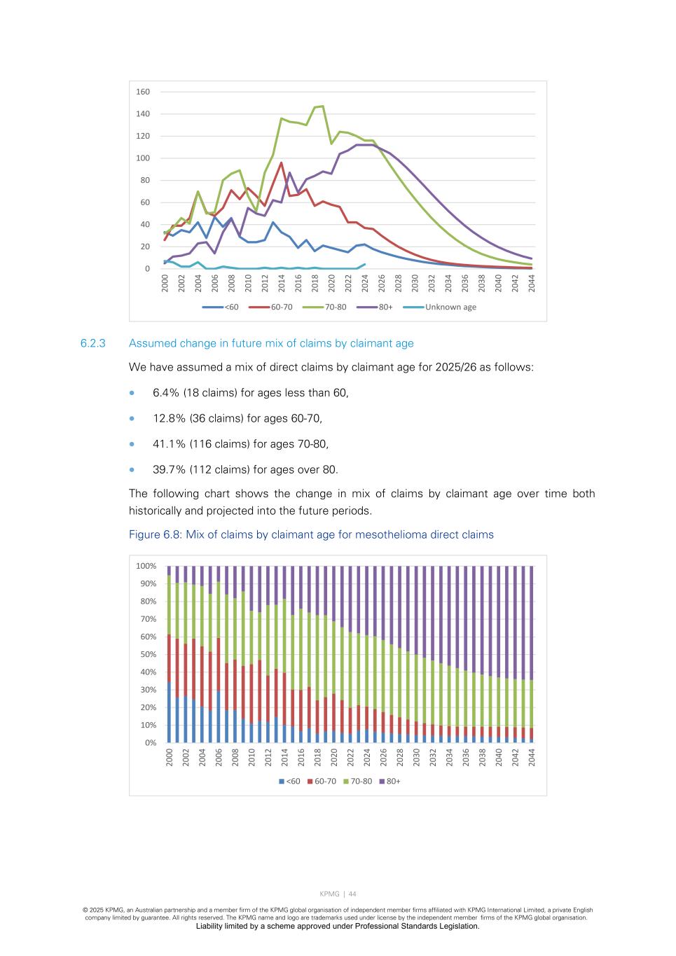 KPMG | 44 © 2025 KPMG, an Australian partnership and a member firm of the KPMG global organisation of independent member firms affiliated with KPMG International Limited, a private English company limited by guarantee. All rights reserved. The KPMG name and logo are trademarks used under license by the independent member firms of the KPMG global organisation. Liability limited by a scheme approved under Professional Standards Legislation. 6.2.3 Assumed change in future mix of claims by claimant age We have assumed a mix of direct claims by claimant age for 2025/26 as follows: • 6.4% (18 claims) for ages less than 60, • 12.8% (36 claims) for ages 60-70, • 41.1% (116 claims) for ages 70-80, • 39.7% (112 claims) for ages over 80. The following chart shows the change in mix of claims by claimant age over time both historically and projected into the future periods. Figure 6.8: Mix of claims by claimant age for mesothelioma direct claims 0 20 40 60 80 100 120 140 160 20 00 20 02 20 04 20 06 20 08 20 10 20 12 20 14 20 16 20 18 20 20 20 22 20 24 20 26 20 28 20 30 20 32 20 34 20 36 20 38 20 40 20 42 20 44 <60 60-70 70-80 80+ Unknown age 0% 10% 20% 30% 40% 50% 60% 70% 80% 90% 100% 20 00 20 02 20 04 20 06 20 08 20 10 20 12 20 14 20 16 20 18 20 20 20 22 20 24 20 26 20 28 20 30 20 32 20 34 20 36 20 38 20 40 20 42 20 44 <60 60-70 70-80 80+