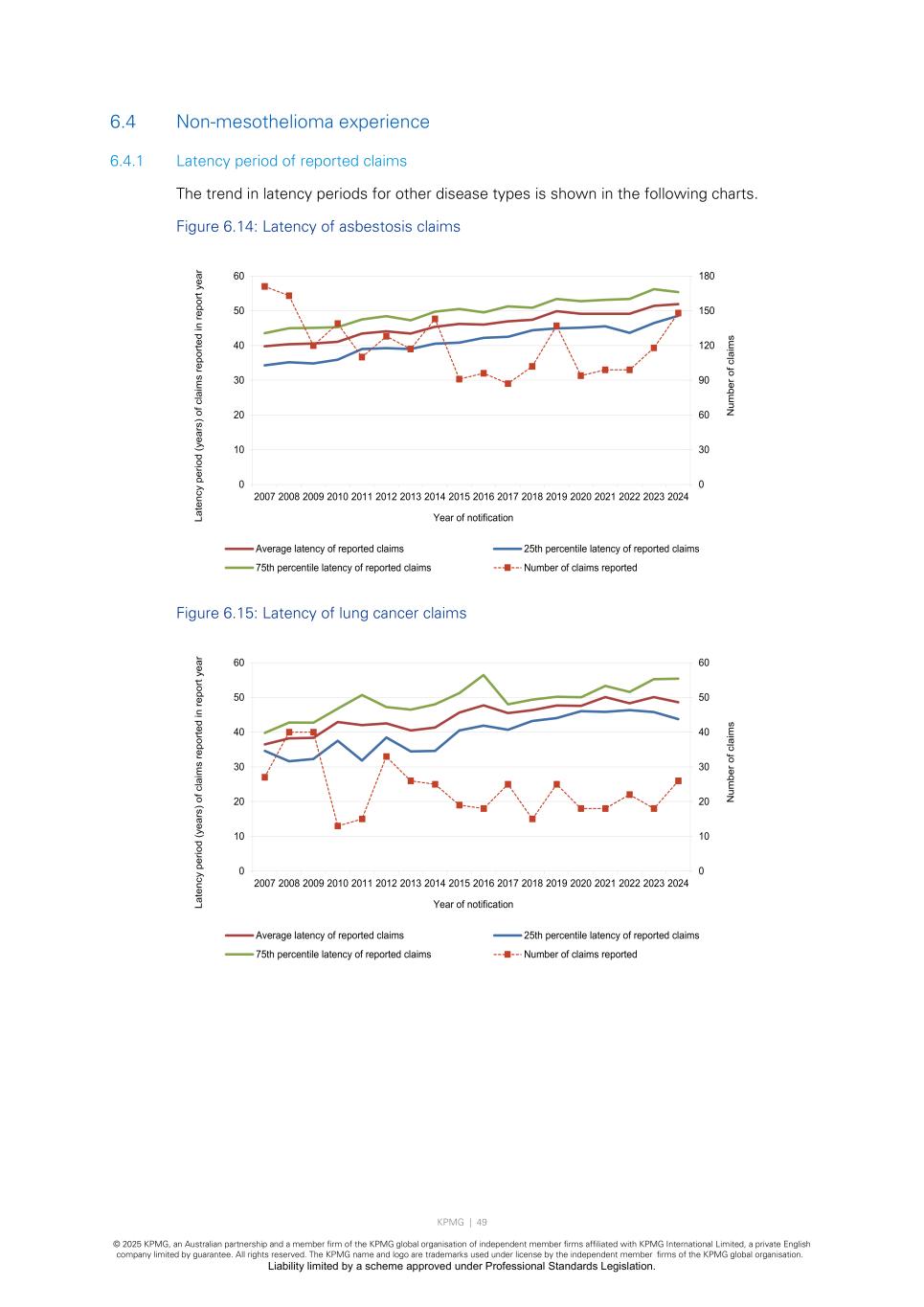 KPMG | 49 © 2025 KPMG, an Australian partnership and a member firm of the KPMG global organisation of independent member firms affiliated with KPMG International Limited, a private English company limited by guarantee. All rights reserved. The KPMG name and logo are trademarks used under license by the independent member firms of the KPMG global organisation. Liability limited by a scheme approved under Professional Standards Legislation. 6.4 Non-mesothelioma experience 6.4.1 Latency period of reported claims The trend in latency periods for other disease types is shown in the following charts. Figure 6.14: Latency of asbestosis claims Figure 6.15: Latency of lung cancer claims 0 30 60 90 120 150 180 0 10 20 30 40 50 60 2007 2008 2009 2010 2011 2012 2013 2014 2015 2016 2017 2018 2019 2020 2021 2022 2023 2024 N um be r o f c la im s La te nc y pe rio d (y ea rs ) o f c la im s re po rte d in re po rt ye ar Year of notification Average latency of reported claims 25th percentile latency of reported claims 75th percentile latency of reported claims Number of claims reported 0 10 20 30 40 50 60 0 10 20 30 40 50 60 2007 2008 2009 2010 2011 2012 2013 2014 2015 2016 2017 2018 2019 2020 2021 2022 2023 2024 N um be r o f c la im s La te nc y pe rio d (y ea rs ) o f c la im s re po rte d in re po rt ye ar Year of notification Average latency of reported claims 25th percentile latency of reported claims 75th percentile latency of reported claims Number of claims reported