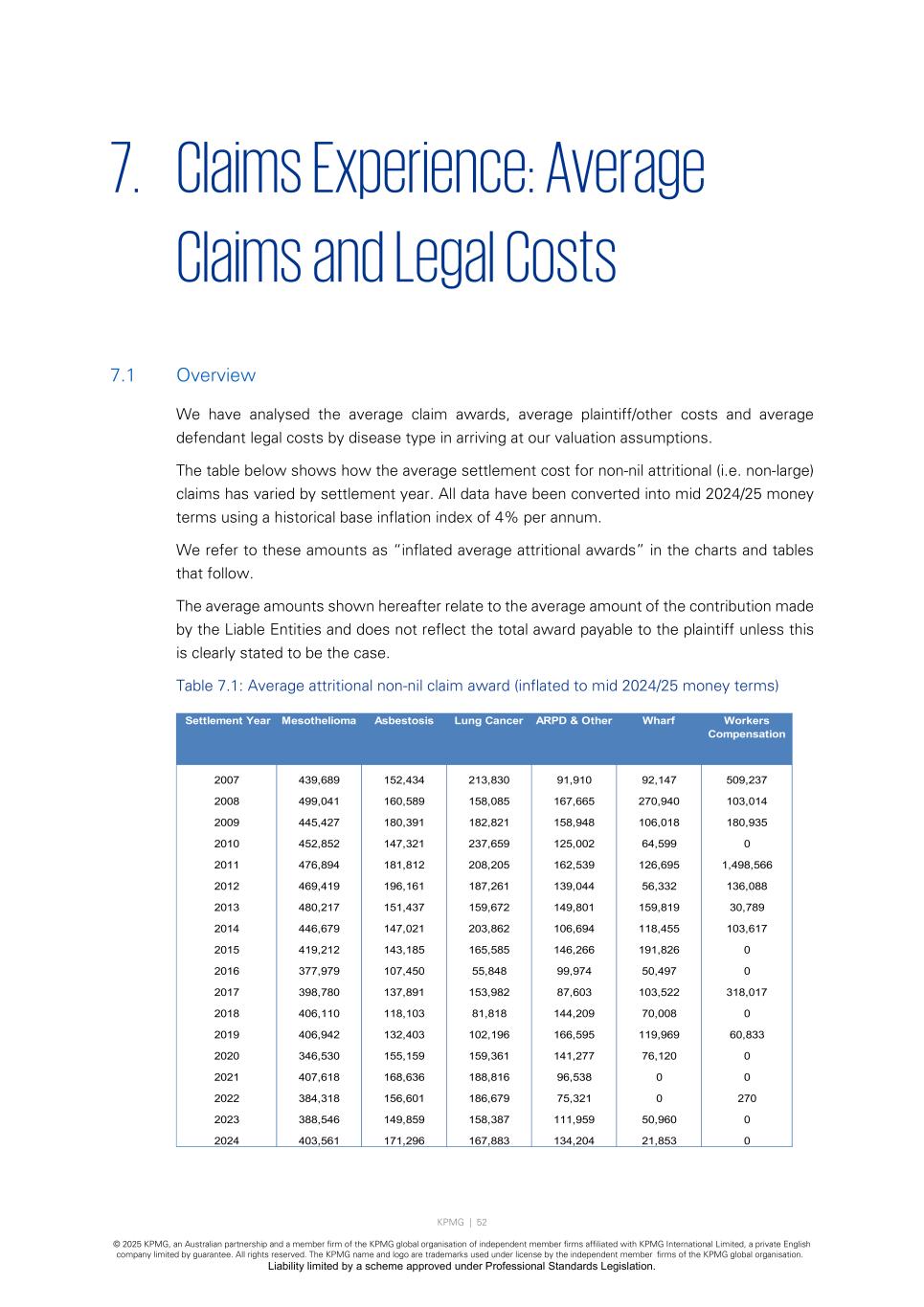 KPMG | 52 © 2025 KPMG, an Australian partnership and a member firm of the KPMG global organisation of independent member firms affiliated with KPMG International Limited, a private English company limited by guarantee. All rights reserved. The KPMG name and logo are trademarks used under license by the independent member firms of the KPMG global organisation. Liability limited by a scheme approved under Professional Standards Legislation. 7. Claims Experience: Average Claims and Legal Costs 7.1 Overview We have analysed the average claim awards, average plaintiff/other costs and average defendant legal costs by disease type in arriving at our valuation assumptions. The table below shows how the average settlement cost for non-nil attritional (i.e. non-large) claims has varied by settlement year. All data have been converted into mid 2024/25 money terms using a historical base inflation index of 4% per annum. We refer to these amounts as “inflated average attritional awards” in the charts and tables that follow. The average amounts shown hereafter relate to the average amount of the contribution made by the Liable Entities and does not reflect the total award payable to the plaintiff unless this is clearly stated to be the case. Table 7.1: Average attritional non-nil claim award (inflated to mid 2024/25 money terms) Settlement Year Mesothelioma Asbestosis Lung Cancer ARPD & Other Wharf Workers Compensation 2007 439,689 152,434 213,830 91,910 92,147 509,237 2008 499,041 160,589 158,085 167,665 270,940 103,014 2009 445,427 180,391 182,821 158,948 106,018 180,935 2010 452,852 147,321 237,659 125,002 64,599 0 2011 476,894 181,812 208,205 162,539 126,695 1,498,566 2012 469,419 196,161 187,261 139,044 56,332 136,088 2013 480,217 151,437 159,672 149,801 159,819 30,789 2014 446,679 147,021 203,862 106,694 118,455 103,617 2015 419,212 143,185 165,585 146,266 191,826 0 2016 377,979 107,450 55,848 99,974 50,497 0 2017 398,780 137,891 153,982 87,603 103,522 318,017 2018 406,110 118,103 81,818 144,209 70,008 0 2019 406,942 132,403 102,196 166,595 119,969 60,833 2020 346,530 155,159 159,361 141,277 76,120 0 2021 407,618 168,636 188,816 96,538 0 0 2022 384,318 156,601 186,679 75,321 0 270 2023 388,546 149,859 158,387 111,959 50,960 0 2024 403,561 171,296 167,883 134,204 21,853 0