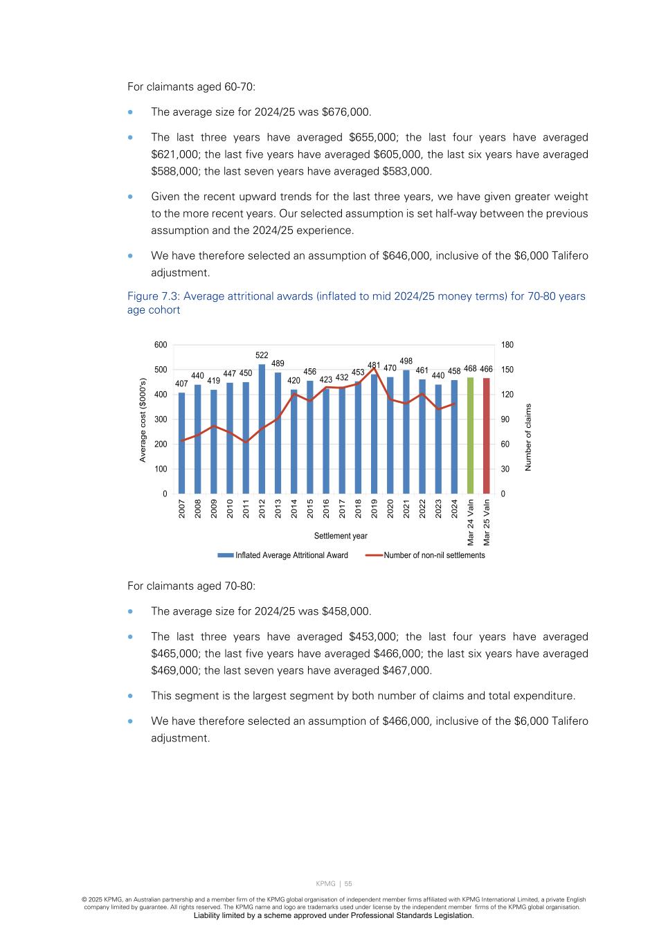 KPMG | 55 © 2025 KPMG, an Australian partnership and a member firm of the KPMG global organisation of independent member firms affiliated with KPMG International Limited, a private English company limited by guarantee. All rights reserved. The KPMG name and logo are trademarks used under license by the independent member firms of the KPMG global organisation. Liability limited by a scheme approved under Professional Standards Legislation. For claimants aged 60-70: • The average size for 2024/25 was $676,000. • The last three years have averaged $655,000; the last four years have averaged $621,000; the last five years have averaged $605,000, the last six years have averaged $588,000; the last seven years have averaged $583,000. • Given the recent upward trends for the last three years, we have given greater weight to the more recent years. Our selected assumption is set half-way between the previous assumption and the 2024/25 experience. • We have therefore selected an assumption of $646,000, inclusive of the $6,000 Talifero adjustment. Figure 7.3: Average attritional awards (inflated to mid 2024/25 money terms) for 70-80 years age cohort For claimants aged 70-80: • The average size for 2024/25 was $458,000. • The last three years have averaged $453,000; the last four years have averaged $465,000; the last five years have averaged $466,000; the last six years have averaged $469,000; the last seven years have averaged $467,000. • This segment is the largest segment by both number of claims and total expenditure. • We have therefore selected an assumption of $466,000, inclusive of the $6,000 Talifero adjustment. 407 440 419 447 450 522 489 420 456 423 432 453 481 470 498 461 440 458 468 466 0 30 60 90 120 150 180 0 100 200 300 400 500 600 20 07 20 08 20 09 20 10 20 11 20 12 20 13 20 14 20 15 20 16 20 17 20 18 20 19 20 20 20 21 20 22 20 23 20 24 M ar 2 4 V al n M ar 2 5 V al n N um be r of c la im s A ve ra ge c os t ( $0 00 's ) Settlement year Inflated Average Attritional Award Number of non-nil settlements