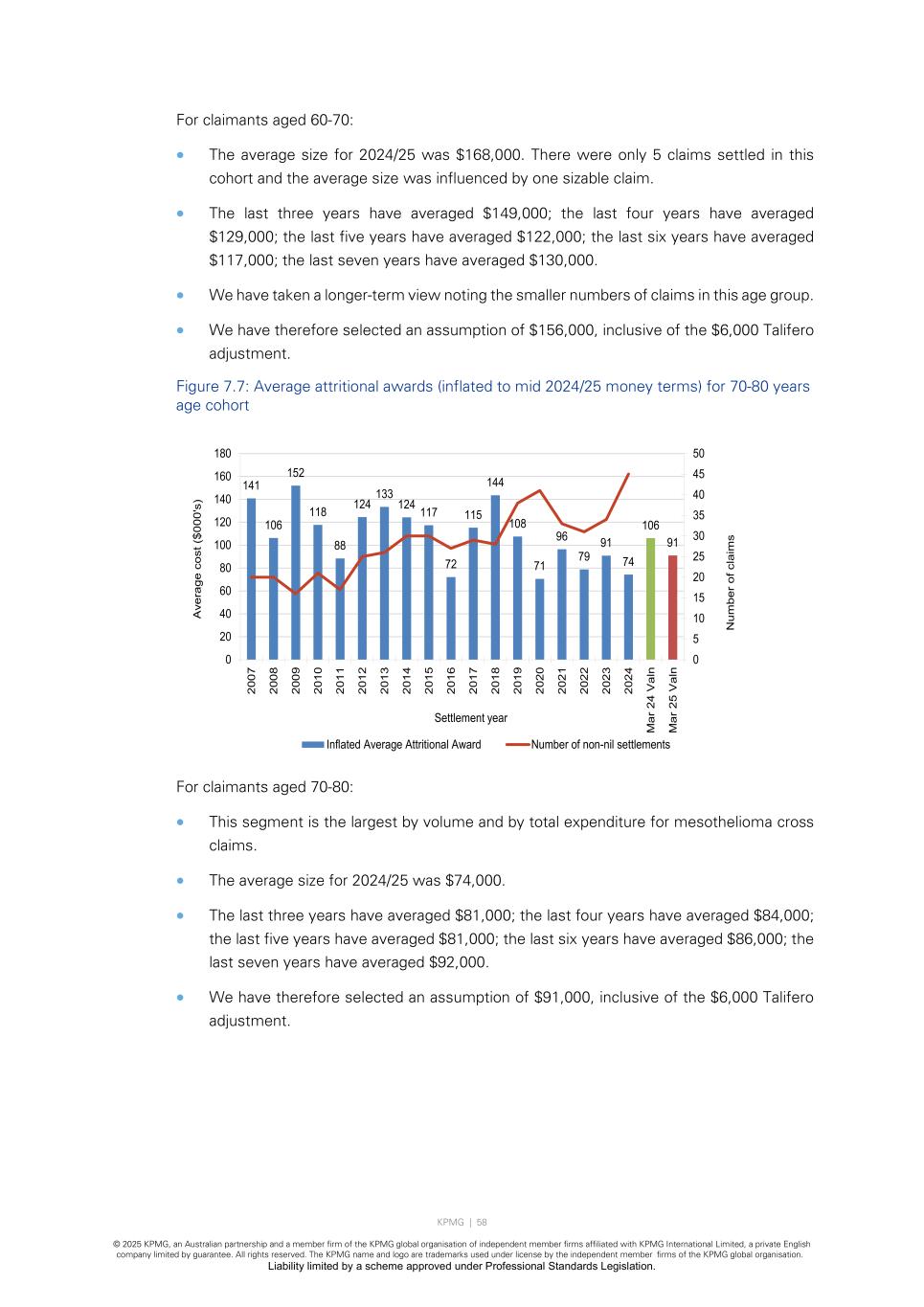 KPMG | 54 © 2025 KPMG, an Australian partnership and a member firm of the KPMG global organisation of independent member firms affiliated with KPMG International Limited, a private English company limited by guarantee. All rights reserved. The KPMG name and logo are trademarks used under license by the independent member firms of the KPMG global organisation. Liability limited by a scheme approved under Professional Standards Legislation. 7.2.3 Mesothelioma: direct claims experience and assumptions The charts below show the average claim size by age cohort since 2007/08 for direct mesothelioma claims. Figure 7.1: Average attritional awards (inflated to mid 2024/25 money terms) for <60 years age cohort For claimants under the age of 60: • The average size for 2024/25 was $795,000. • The last three years have averaged $802,000; the last four years have averaged $798,000; the last five years have averaged $761,000, the last six years have averaged $759,000; the last seven years have averaged $766,000. • We have therefore selected an assumption of $796,000, inclusive of the $6,000 Talifero adjustment. Figure 7.2: Average attritional awards (inflated to mid 2024/25 money terms) for 60-70 years age cohort 800 859 753 718 881 774 1,066 849 743 594 820 804 748 514 784 843 780 795 815 796 0 10 20 30 40 50 60 0 200 400 600 800 1,000 1,200 20 07 20 08 20 09 20 10 20 11 20 12 20 13 20 14 20 15 20 16 20 17 20 18 20 19 20 20 20 21 20 22 20 23 20 24 M ar 2 4 Va ln M ar 2 5 Va ln N um be r o f c la im s Av er ag e co st ($ 00 0' s) Settlement year Inflated Average Attritional Award Number of non-nil settlements 524 557 609 619 573 630 627 609 590 492 506 559 516 543 552 646 643 676 615 646 0 10 20 30 40 50 60 70 80 90 0 100 200 300 400 500 600 700 800 900 20 07 20 08 20 09 20 10 20 11 20 12 20 13 20 14 20 15 20 16 20 17 20 18 20 19 20 20 20 21 20 22 20 23 20 24 M ar 2 4 Va ln M ar 2 5 Va ln N um be r o f c la im s Av er ag e co st ($ 00 0' s) Settlement year Inflated Average Attritional Award Number of non-nil settlements