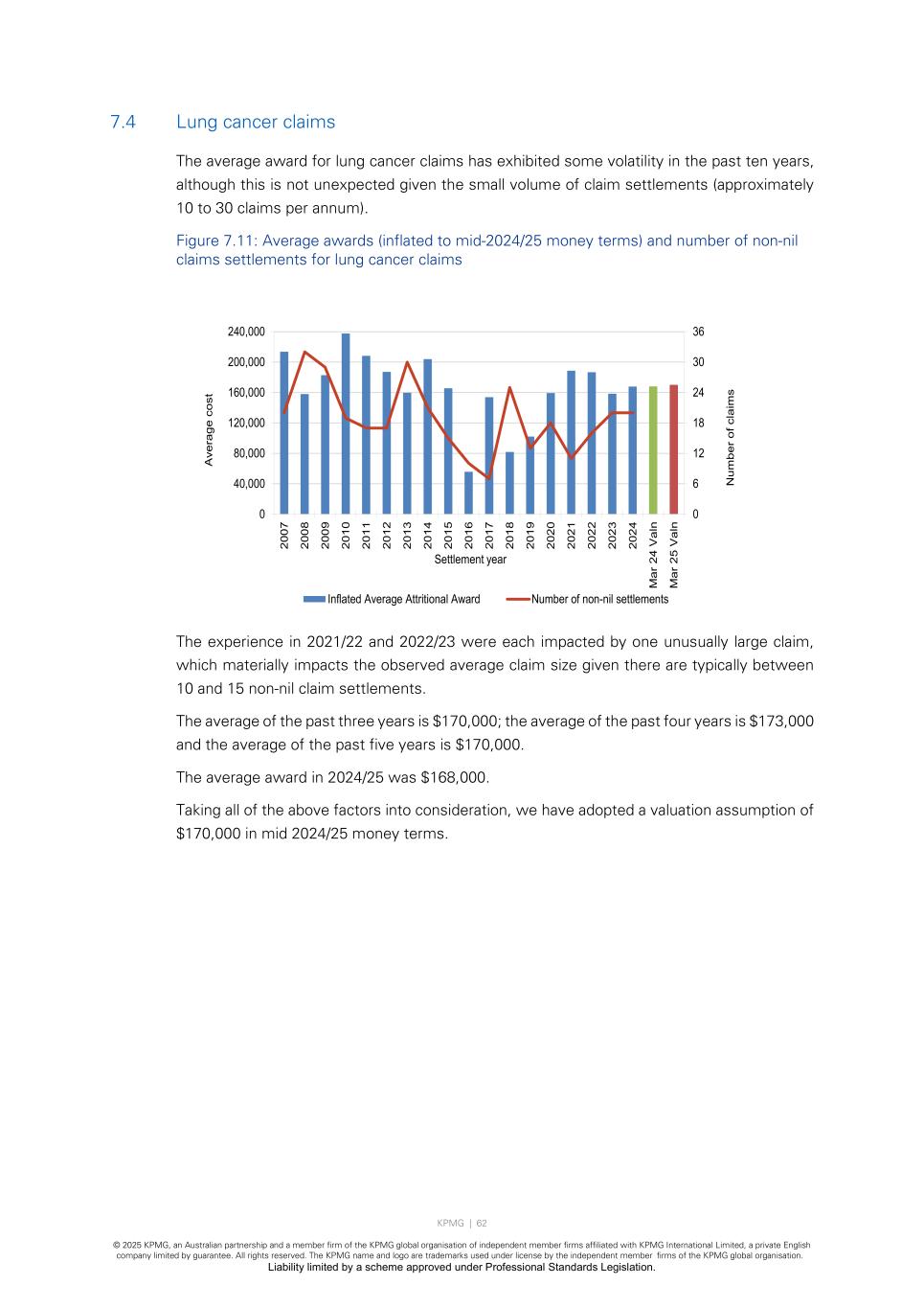 KPMG | 62 © 2025 KPMG, an Australian partnership and a member firm of the KPMG global organisation of independent member firms affiliated with KPMG International Limited, a private English company limited by guarantee. All rights reserved. The KPMG name and logo are trademarks used under license by the independent member firms of the KPMG global organisation. Liability limited by a scheme approved under Professional Standards Legislation. 7.4 Lung cancer claims The average award for lung cancer claims has exhibited some volatility in the past ten years, although this is not unexpected given the small volume of claim settlements (approximately 10 to 30 claims per annum). Figure 7.11: Average awards (inflated to mid-2024/25 money terms) and number of non-nil claims settlements for lung cancer claims The experience in 2021/22 and 2022/23 were each impacted by one unusually large claim, which materially impacts the observed average claim size given there are typically between 10 and 15 non-nil claim settlements. The average of the past three years is $170,000; the average of the past four years is $173,000 and the average of the past five years is $170,000. The average award in 2024/25 was $168,000. Taking all of the above factors into consideration, we have adopted a valuation assumption of $170,000 in mid 2024/25 money terms. 0 6 12 18 24 30 36 0 40,000 80,000 120,000 160,000 200,000 240,000 20 07 20 08 20 09 20 10 20 11 20 12 20 13 20 14 20 15 20 16 20 17 20 18 20 19 20 20 20 21 20 22 20 23 20 24 M ar 2 4 V al n M ar 2 5 V al n N um be r of c la im s A ve ra ge c os t Settlement year Inflated Average Attritional Award Number of non-nil settlements